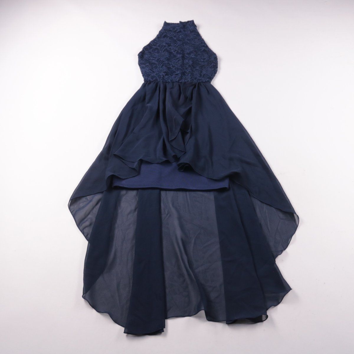 Вечернее платье Quiz тёмно-синего цвета с кружевным лифом и воротником халтер. Многослойная юбка из лёгкой ткани с асимметричным (high-low) низом подойдёт для выпускного, свадьбы или торжественного вечера. Есть подкладка, поэтому платье комфортно носить и ткань меньше просвечивает.