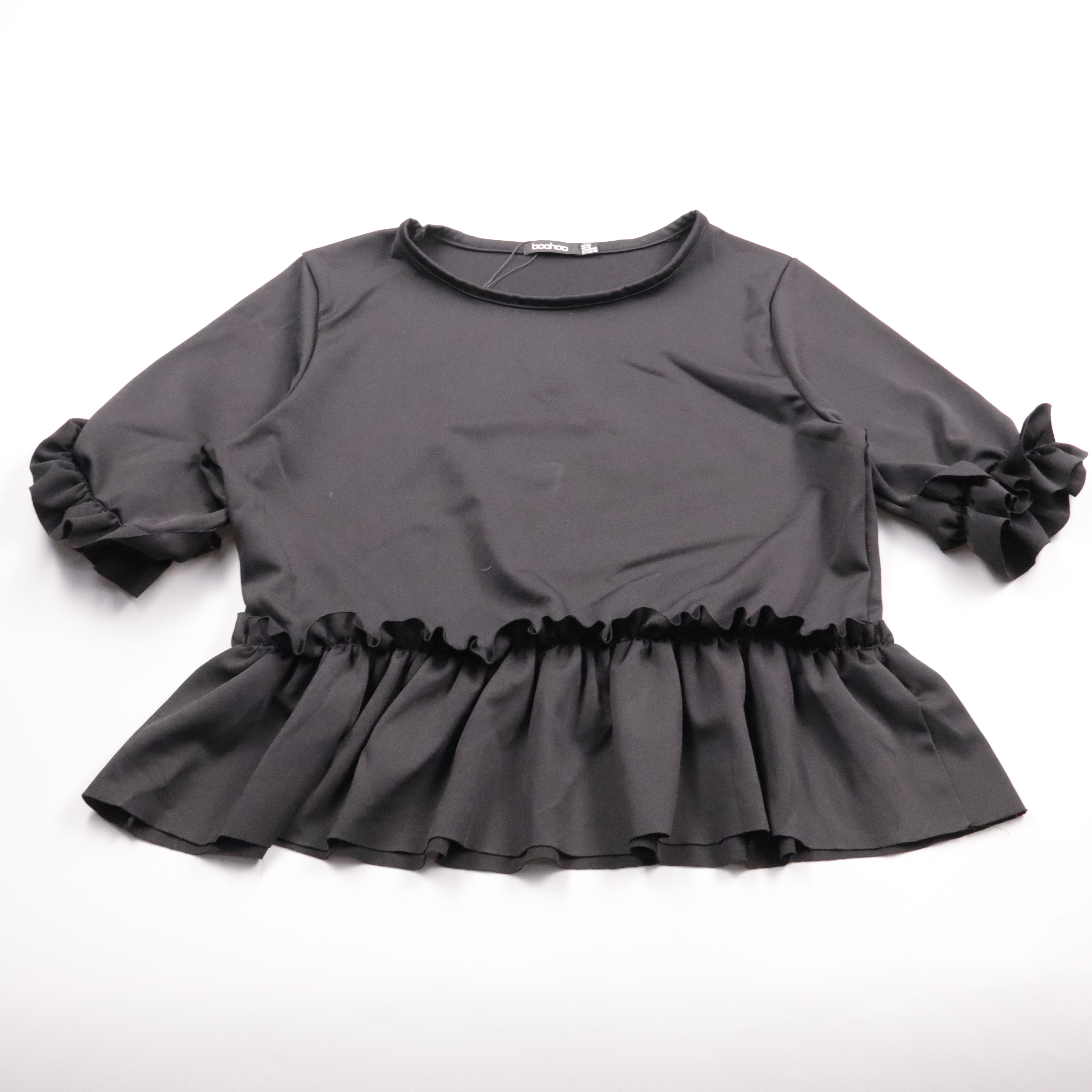 Чёрная блузка Boohoo с рукавами 3/4 и эффектными воланами по низу и на манжетах. Подойдёт для повседневных образов и для выхода, хорошо сочетается с брюками или юбкой с высокой посадкой. Ткань слегка тянется и комфортно садится по фигуре.