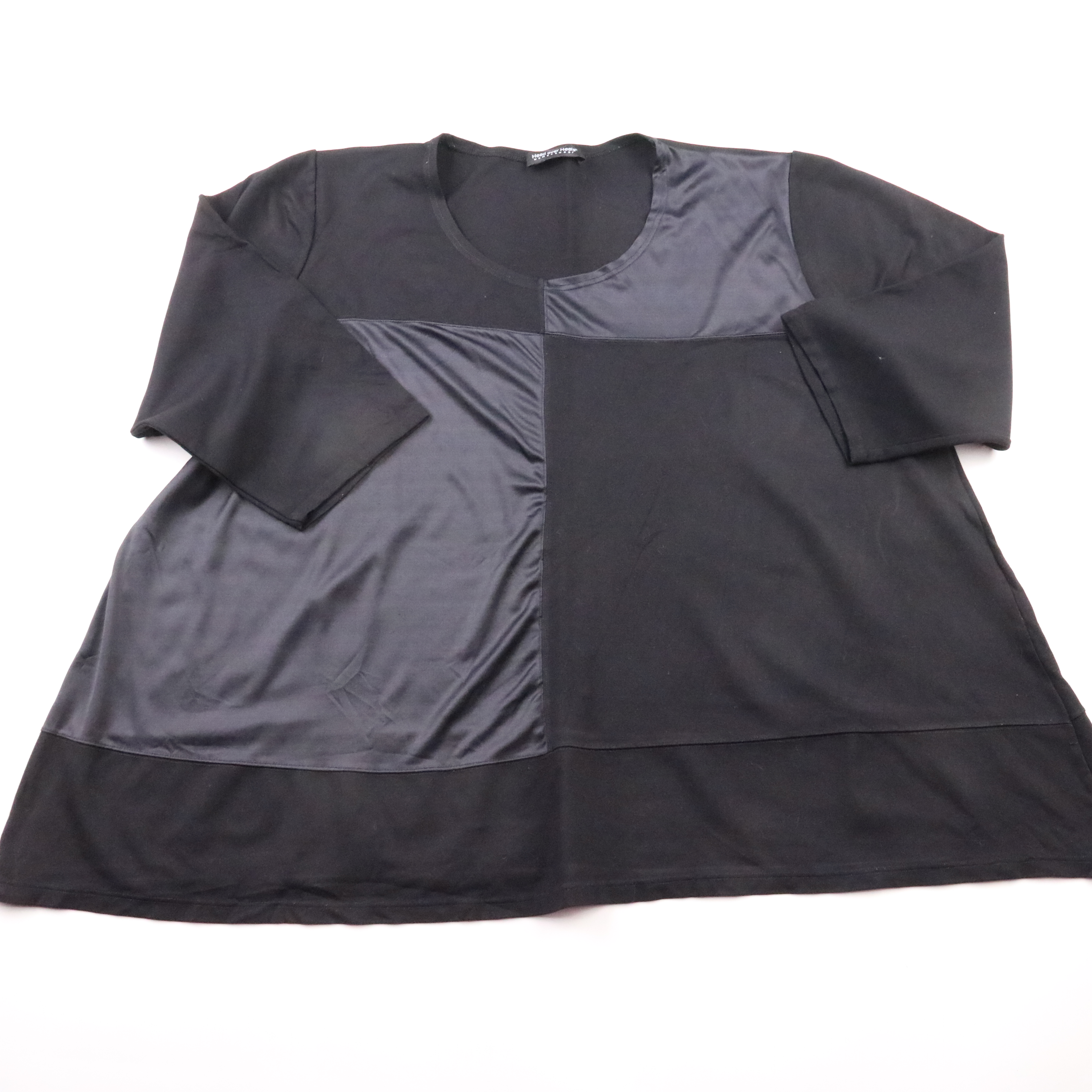 Чёрная блузка Head over Heels свободного кроя с комбинированными вставками из гладкой ткани. Подойдёт для офиса и повседневных образов, хорошо смотрится с брюками и юбками. Практична тем, что почти не мнётся и легко сочетается с базовым гардеробом.