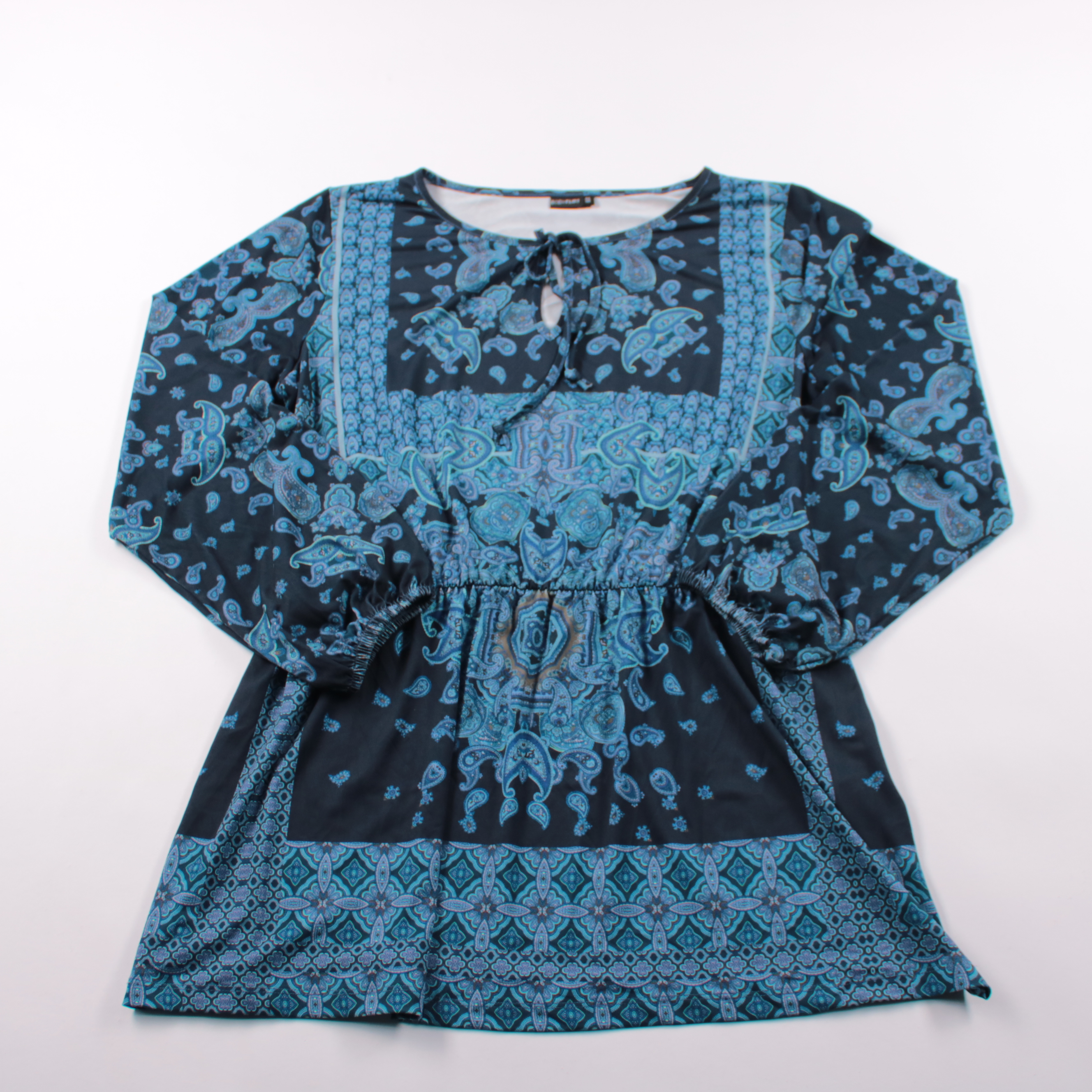 Блузка Bodyflirt с орнаментальным принтом и завязкой у горловины, рукава длинные. Подойдёт для повседневных образов и офиса с однотонными брюками или юбкой. Материал тянется за счёт эластана и комфортно садится по фигуре.