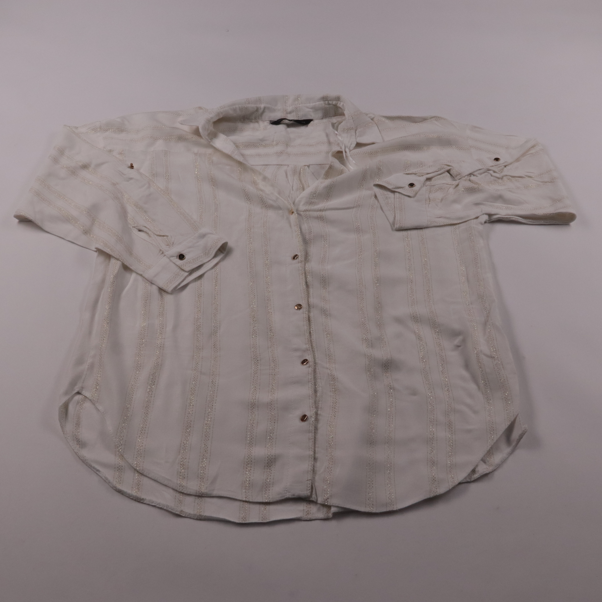 Блузка F&F белого цвета с деликатной вертикальной полоской с золотистой нитью и застёжкой на пуговицы. Подойдёт для офиса и повседневных образов, легко сочетается с джинсами или юбкой. Ткань мягкая и приятная к телу, выглядит аккуратно и неброско нарядно.