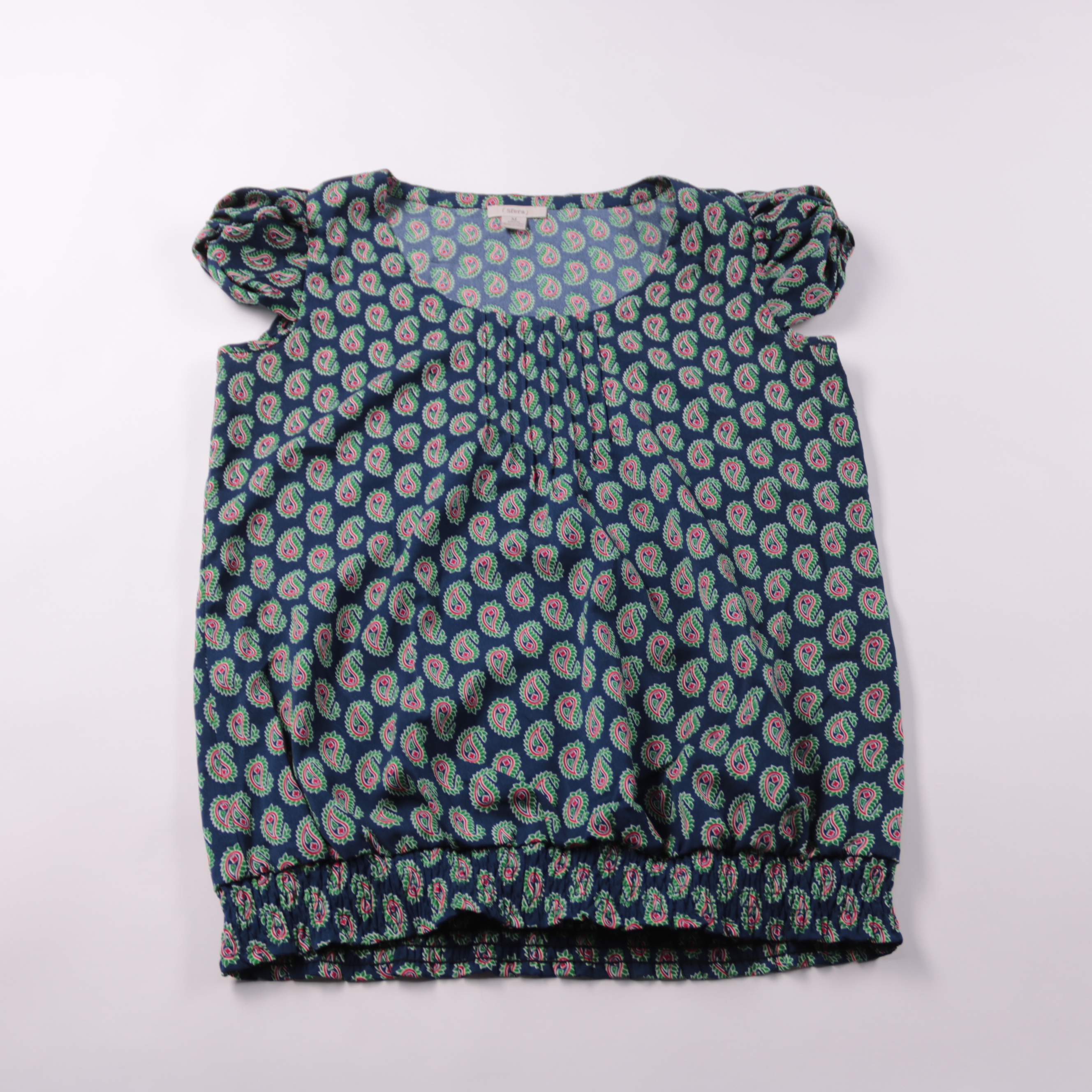 Блузка Sfera из 100% полиэстера, тёмно-синяя с принтом пейсли и короткими рукавами-фонариками. Подойдёт для повседневных летних образов и отпуска, хорошо сочетается с джинсами, шортами или однотонной юбкой. Лёгкая ткань почти не мнётся и быстро сохнет.