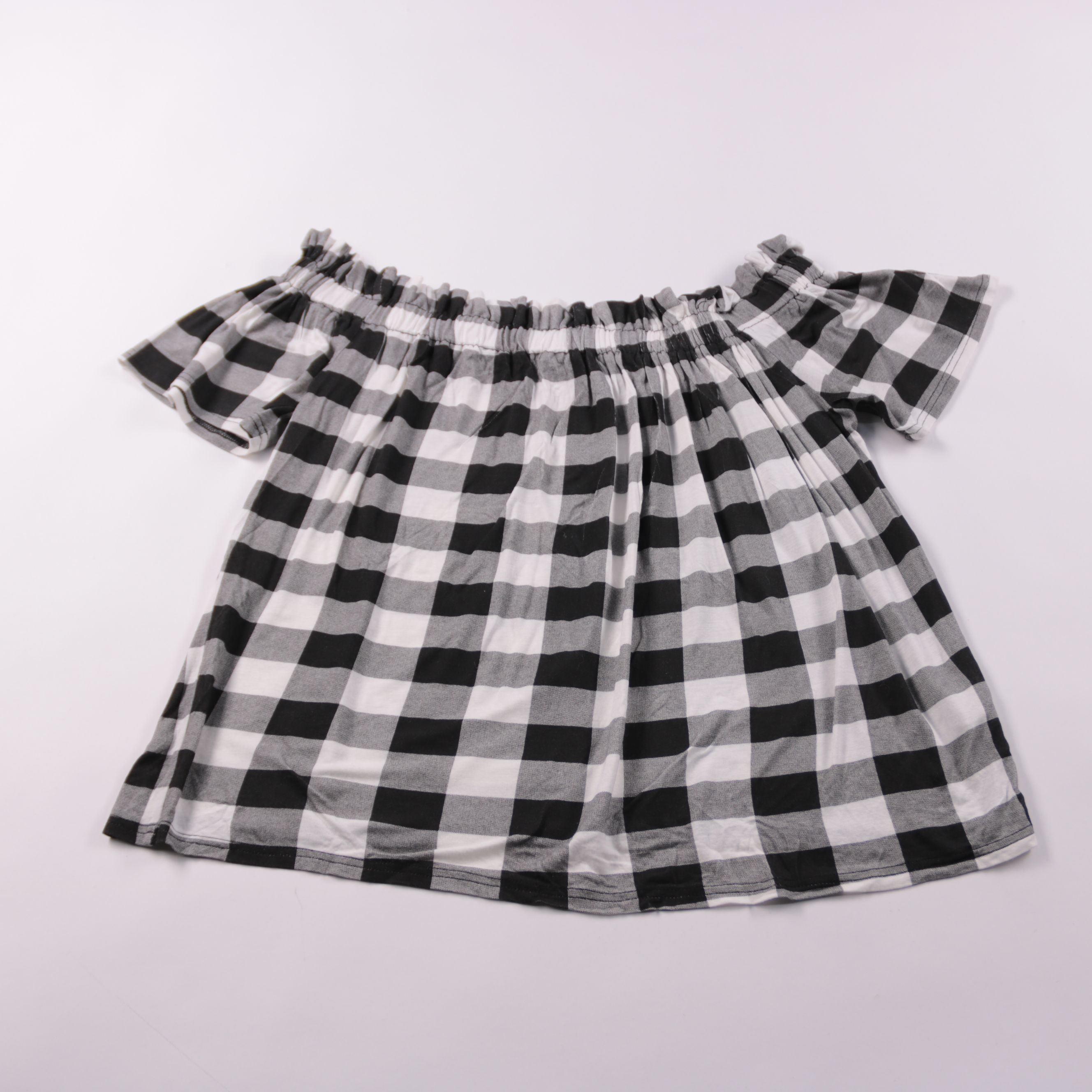 Женская блузка Primark с открытыми плечами и эластичной сборкой по горловине, принт в крупную чёрно-белую клетку. Лёгкая и удобная, подойдёт для лета и отдыха, хорошо сочетается с джинсами или шортами. Материал тянется за счёт эластана и комфортно сади...