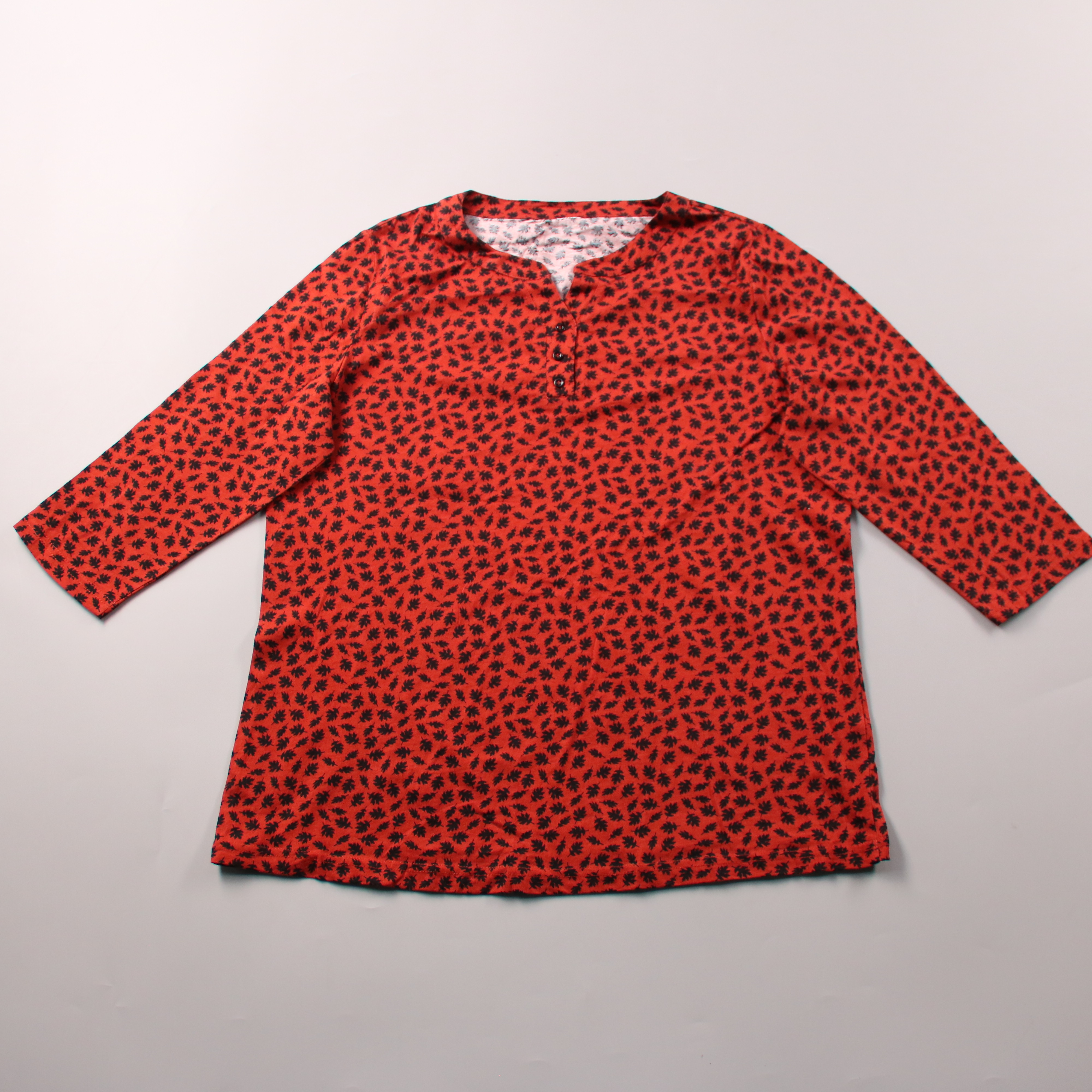 Женская блузка красного цвета с мелким чёрным принтом и застёжкой на пуговицы у горловины. Подойдёт для повседневных образов и офиса в стиле casual, хорошо сочетается с джинсами и однотонными брюками. Ткань мягкая и лёгкая, удобно носить как самостояте...