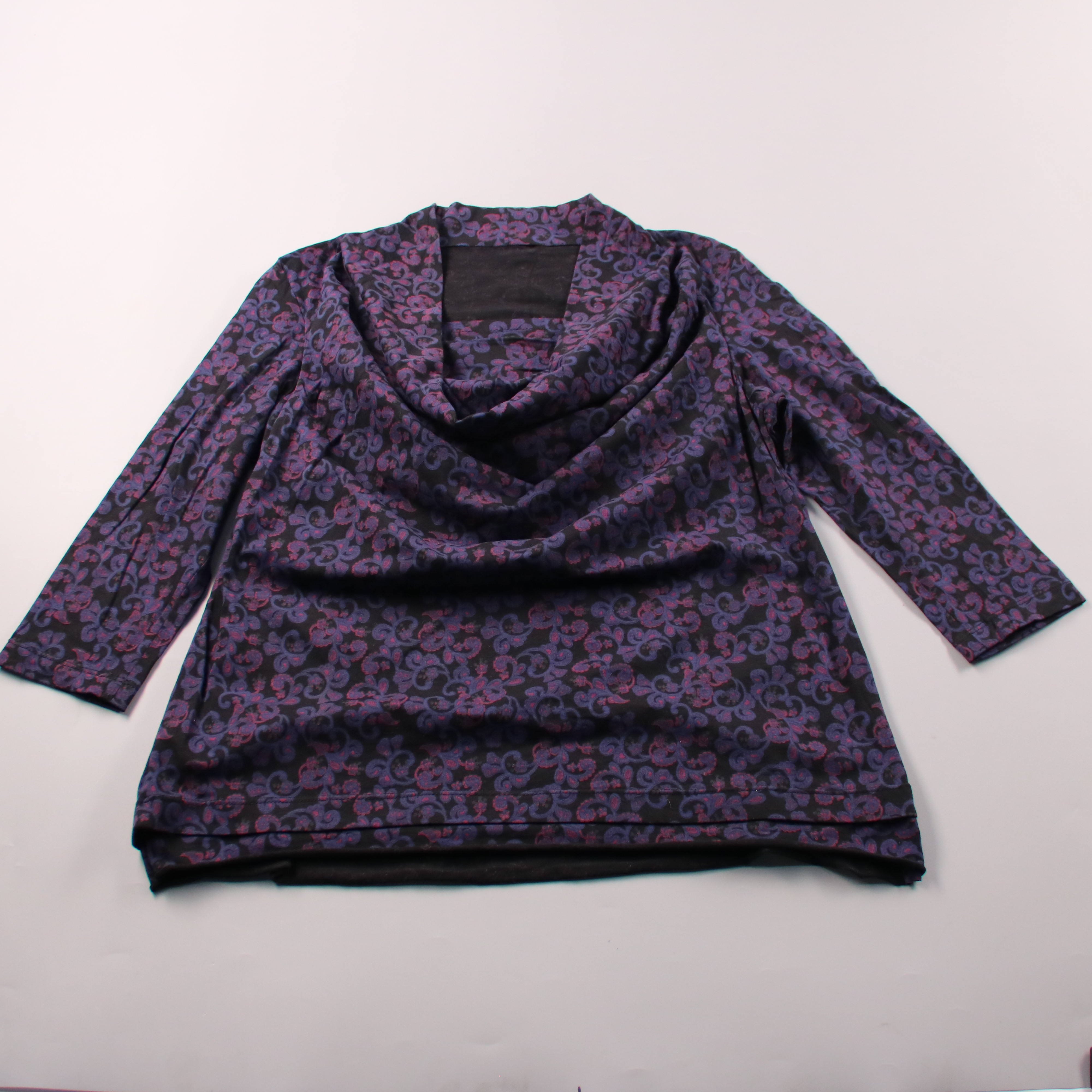Женская блузка с драпированным воротником-качелями и узором в сине-фиолетовой гамме. Подойдёт для офиса и повседневных образов, хорошо смотрится с однотонными брюками или юбкой. Практичный плюс — мягкий эластичный материал почти не мнётся и комфортно с...