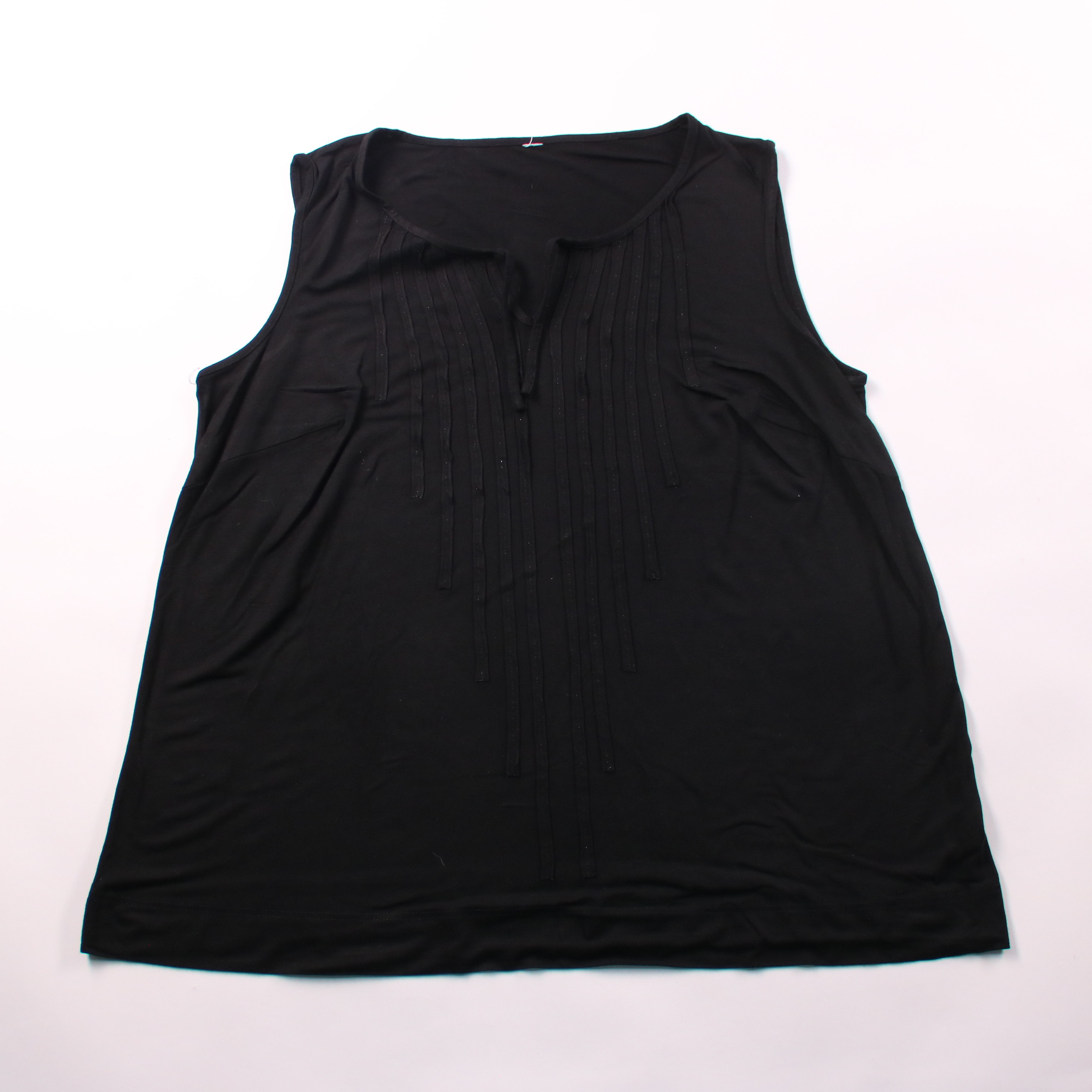 Женская чёрная блузка без рукавов с декоративными вертикальными защипами спереди и небольшим V-разрезом у горловины. Подойдёт для офиса и на каждый день, легко сочетается с брюками и юбками. Практичный плюс — эластичная вискоза, комфортно сидит и почти...