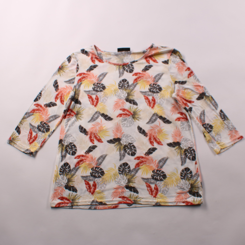 Блузка Janina с тропическим принтом и рукавом 3/4. Подойдёт для лета и отпуска, легко сочетается с джинсами, шортами или однотонной юбкой. Тонкая ткань быстро сохнет и комфортна в жару.