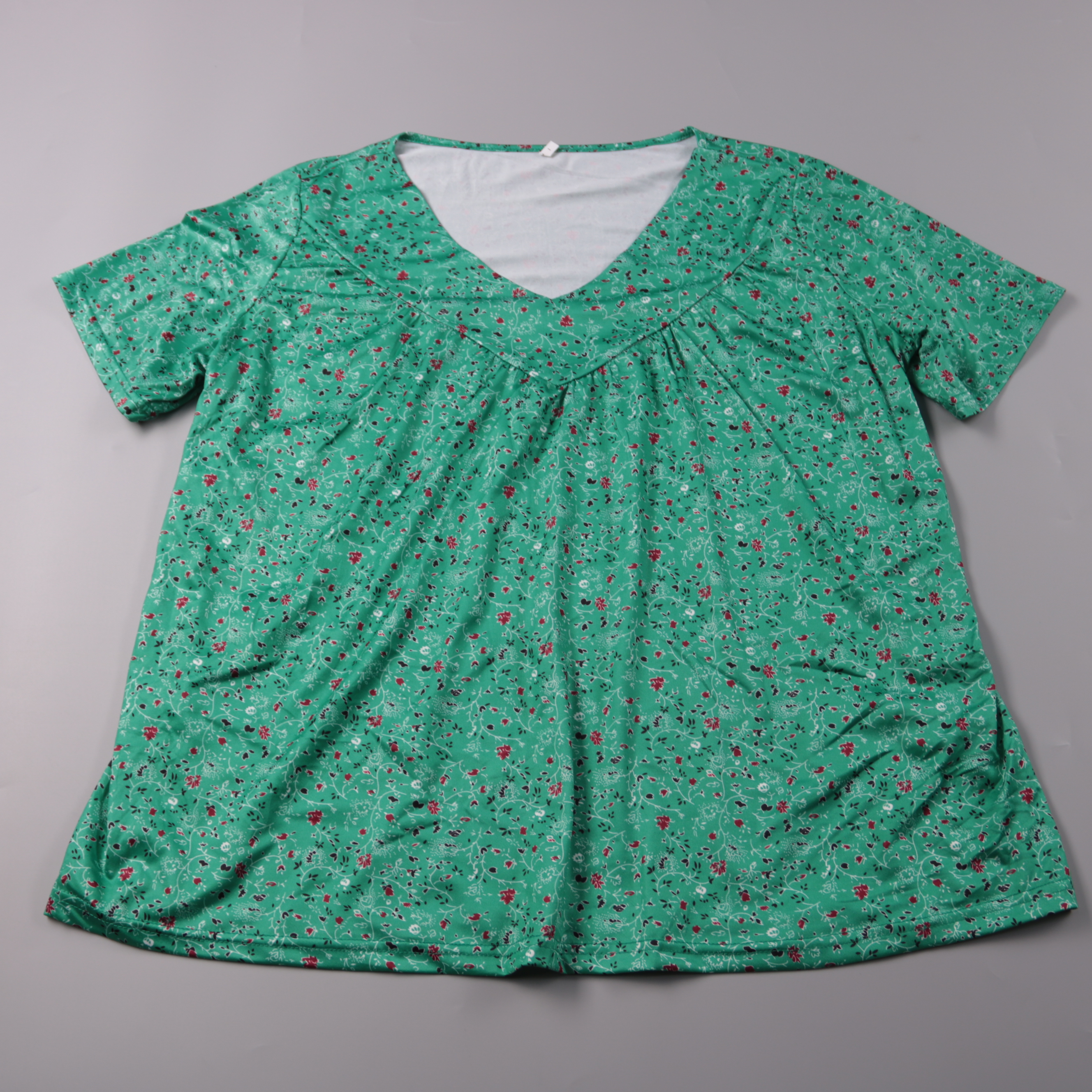 Женская блузка с коротким рукавом и V-образным вырезом, выполнена в зелёном цвете с мелким цветочным принтом. Подойдёт для повседневных летних образов, на прогулку или в поездку. Лёгкая ткань и свободный крой не сковывают движения и комфортны в жару.