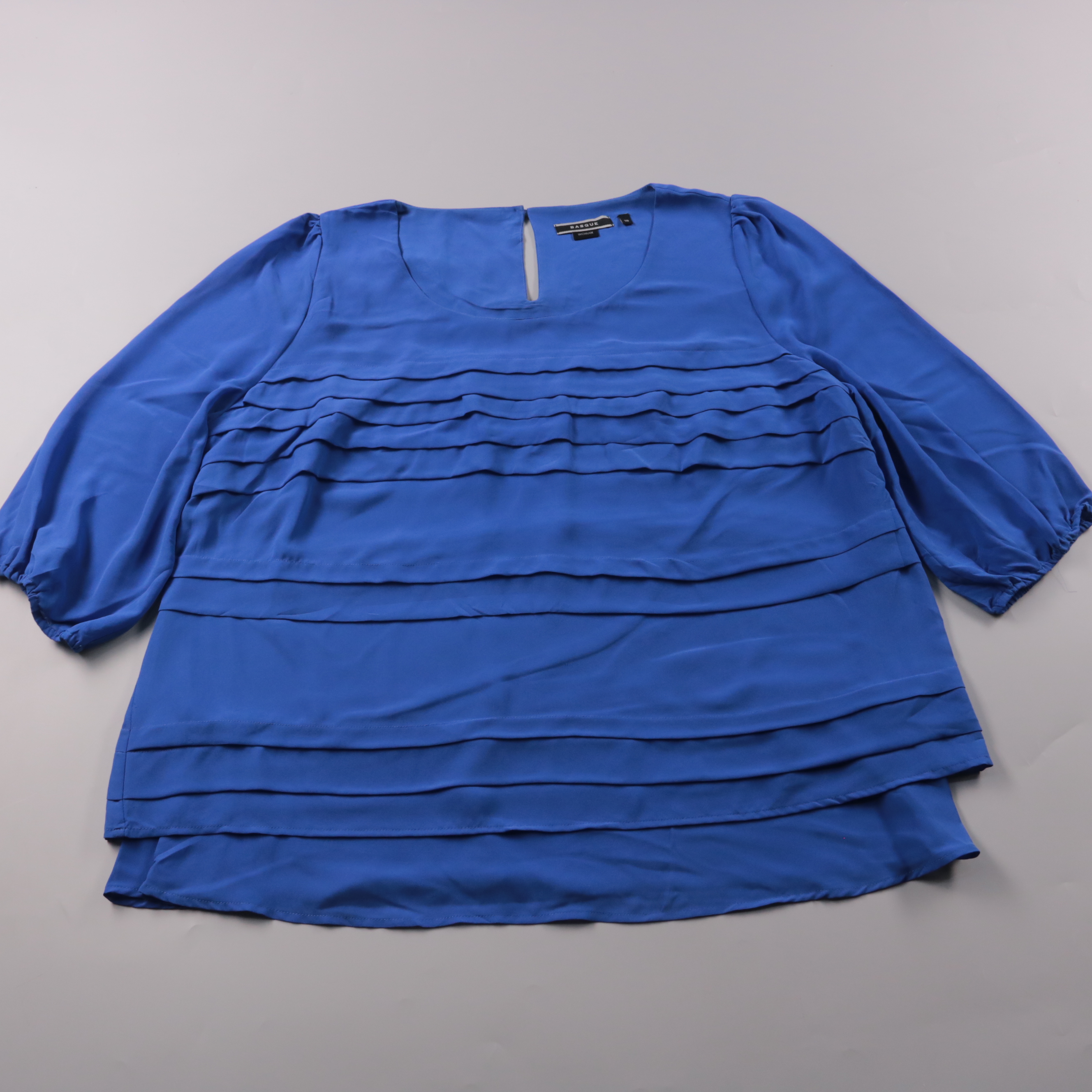 Женская блузка Basque ярко-синего цвета с декоративными горизонтальными складками и рукавом 3/4. Подойдёт для офиса и повседневных образов с брюками или юбкой. Практична в уходе и почти не мнётся за счёт полиэстера.