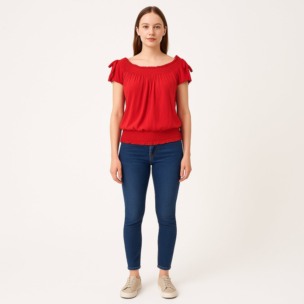 Красная блузка Yessica с открытой линией плеч и сборкой-резинкой по горловине и низу. Подойдёт для летних прогулок и повседневных образов с джинсами или юбкой. Эластичная отделка хорошо фиксирует посадку и не сковывает движения.