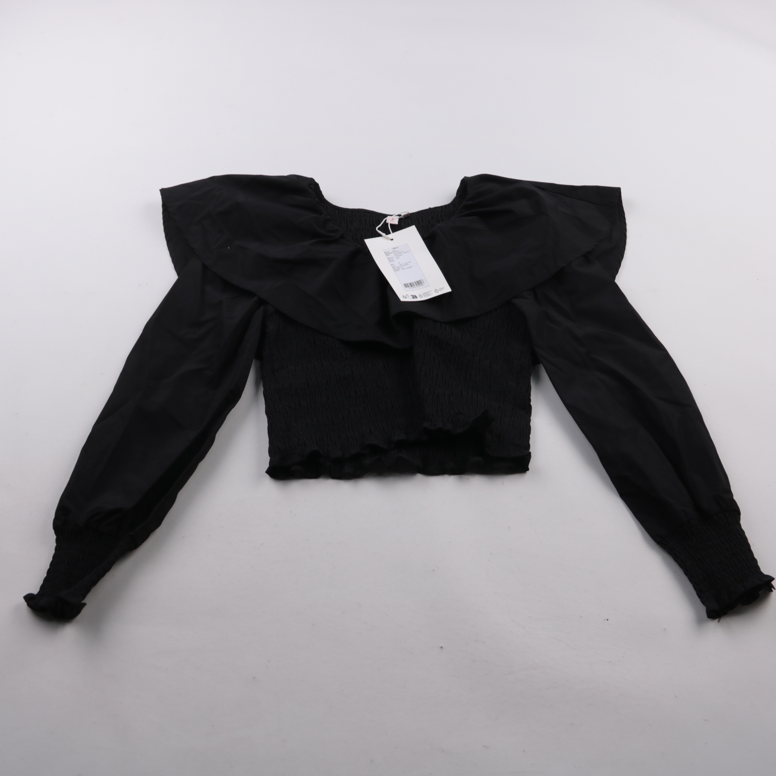 Чёрная блузка Only с V-образным вырезом и крупным воланом по линии плеч. Подойдёт для вечерних выходов и на каждый день с джинсами или юбкой благодаря акцентному верху. Смок на лифе обеспечивает комфортную посадку и хорошо держит форму.