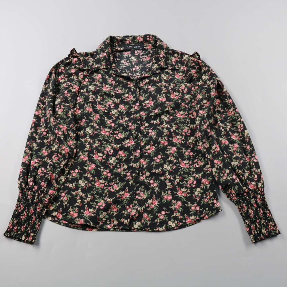 Блузка Lofty Manner с цветочным принтом на чёрном фоне, с отложным воротником и длинными рукавами на сборке. Подойдёт для повседневных и офисных образов, легко сочетается с джинсами или юбкой. Практичный плюс — ткань из полиэстера почти не мнётся и быс...