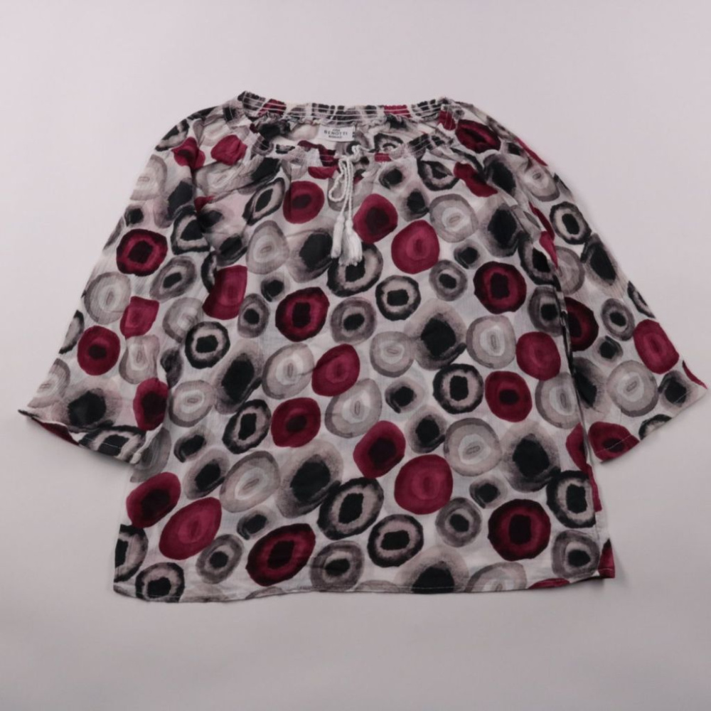 Женская блузка Gina Benotti из хлопка с абстрактным круговым принтом и завязками у горловины. Подойдёт для повседневных образов в тёплую погоду, можно носить с джинсами или однотонной юбкой. Лёгкая ткань и свободный крой дают комфорт и не сковывают дви...