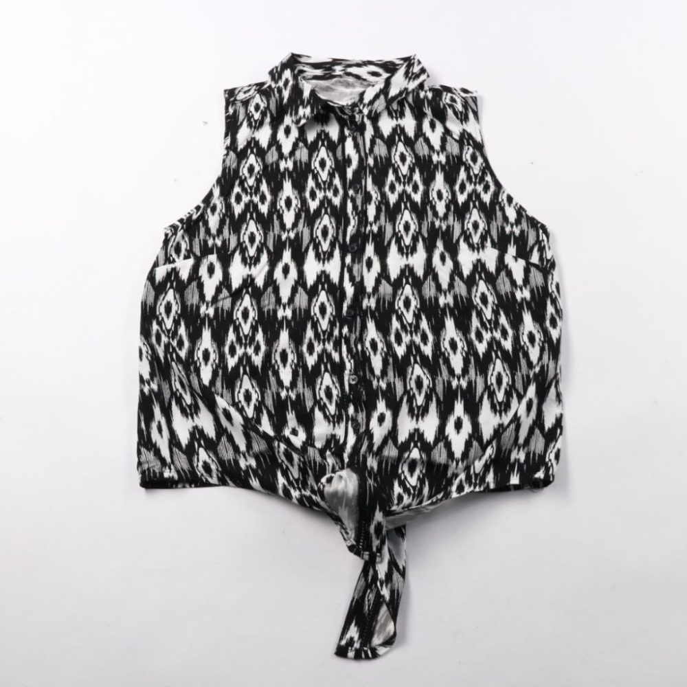 Женская блузка без рукавов с чёрно-белым геометрическим принтом и завязкой спереди. Подойдёт для лета и тёплой погоды, легко сочетается с джинсами или юбкой. Лёгкая ткань и застёжка на пуговицы делают её удобной для повседневной носки.