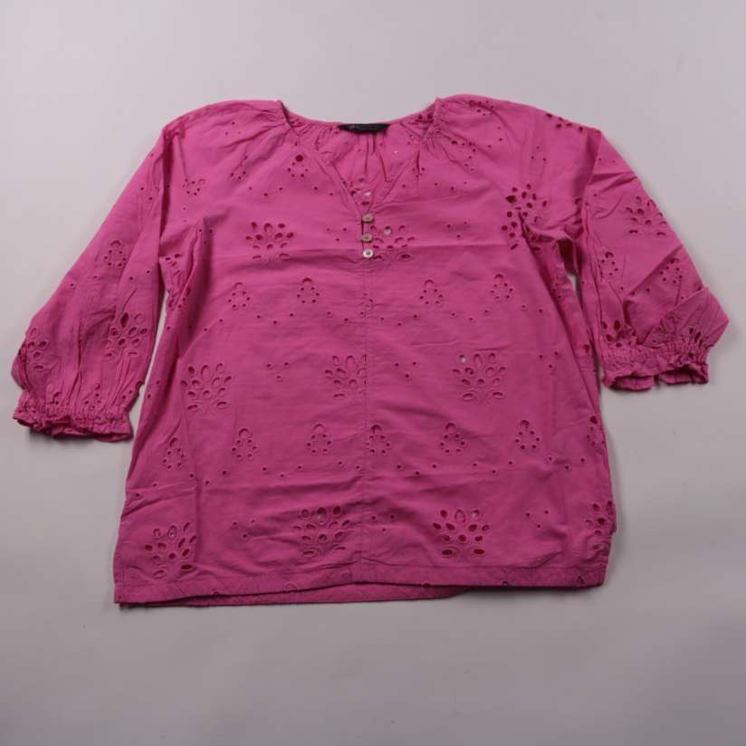 Женская хлопковая блузка M&S Collection ярко-розового цвета с перфорацией и планкой на пуговицах. Подойдёт для лета и отпуска, хорошо смотрится с джинсами или шортами. Дышащая ткань и свободная посадка делают её комфортной в жаркую погоду.