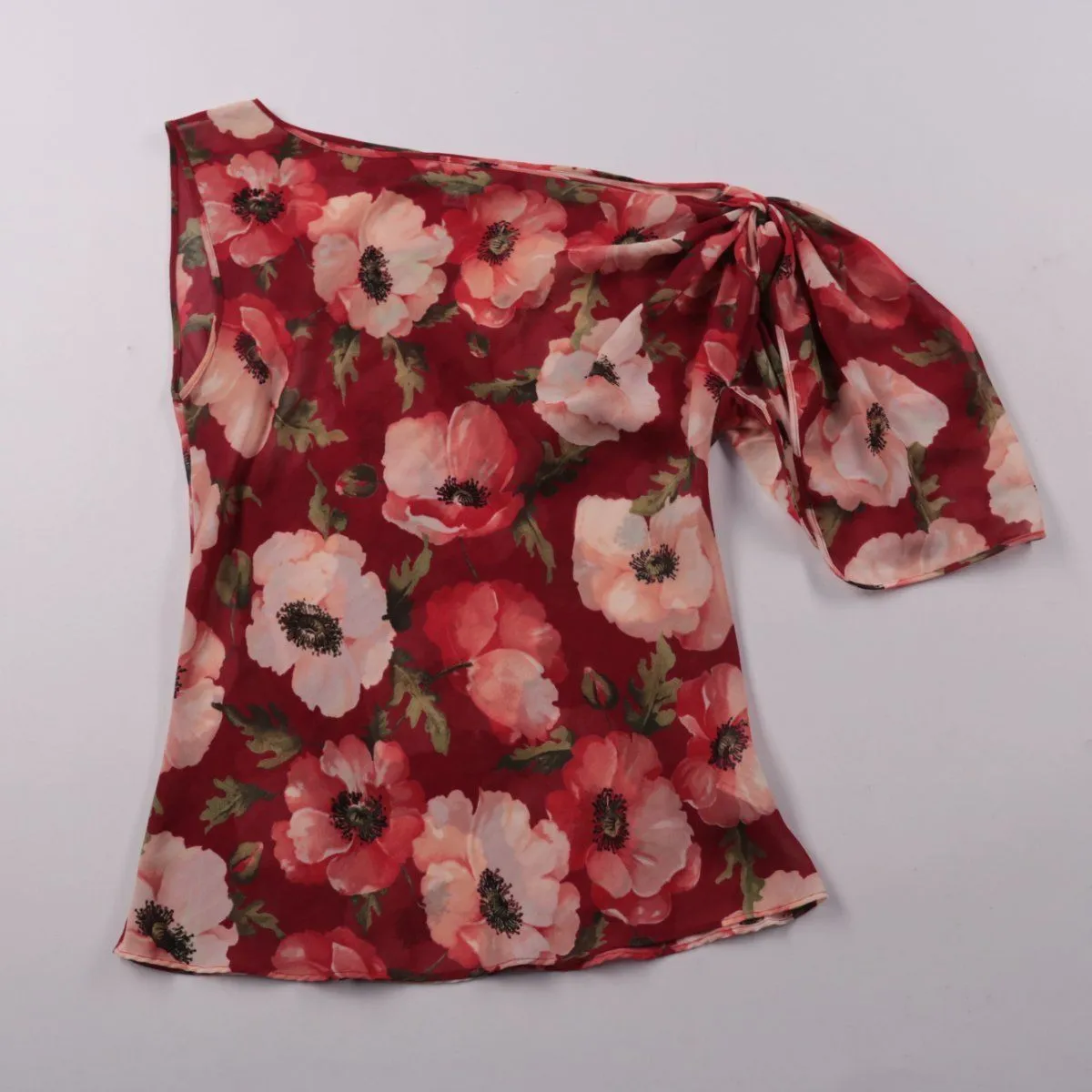 Женская блузка Next с асимметричным вырезом на одно плечо и цветочным принтом на бордовом фоне. Подойдёт для лета и тёплой погоды, хорошо смотрится с джинсами или юбкой. Лёгкий полиэстер быстро сохнет и почти не мнётся.