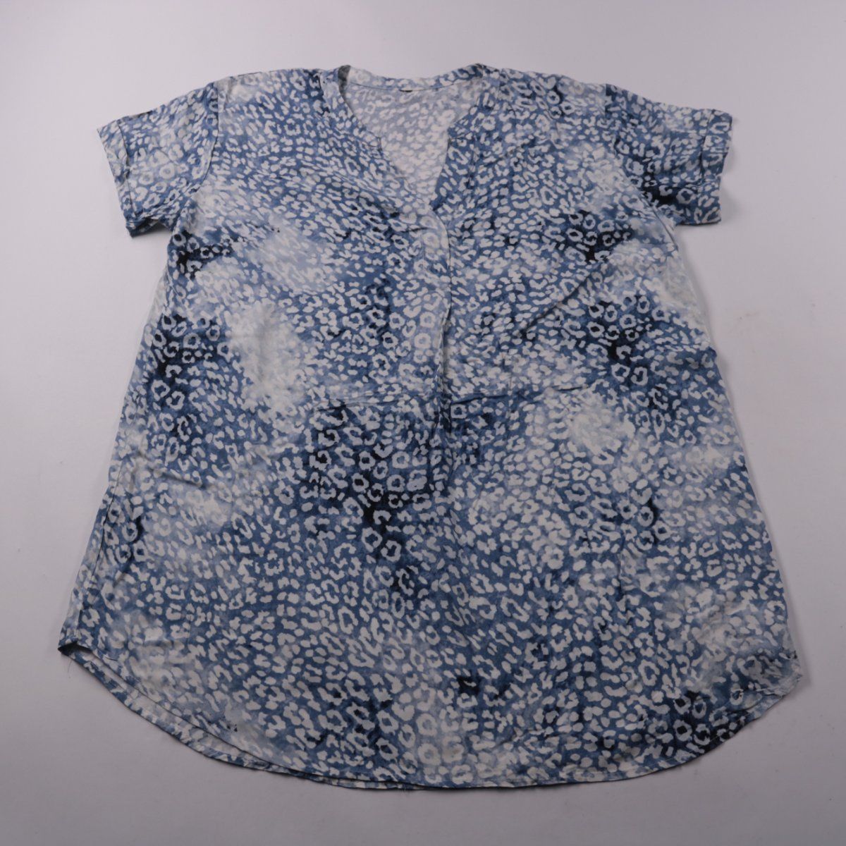 Женская блузка с коротким рукавом и V-образным вырезом, без явного бренда. Сине-белый абстрактный принт и удлинённый крой подойдут для лета и повседневных образов. Лёгкая ткань комфортна в носке и не сковывает движения.