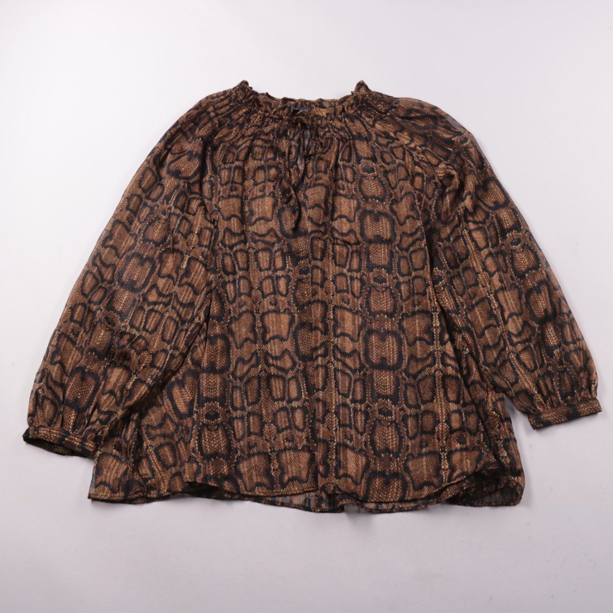 Женская блузка M&S Collection с длинными рукавами и сборкой по горловине, выполнена в коричнево-чёрном «змеиным» принте. Подойдёт для повседневных образов и офиса с базовыми брюками или юбкой. Лёгкий полиэстер прост в уходе и быстро сохнет.