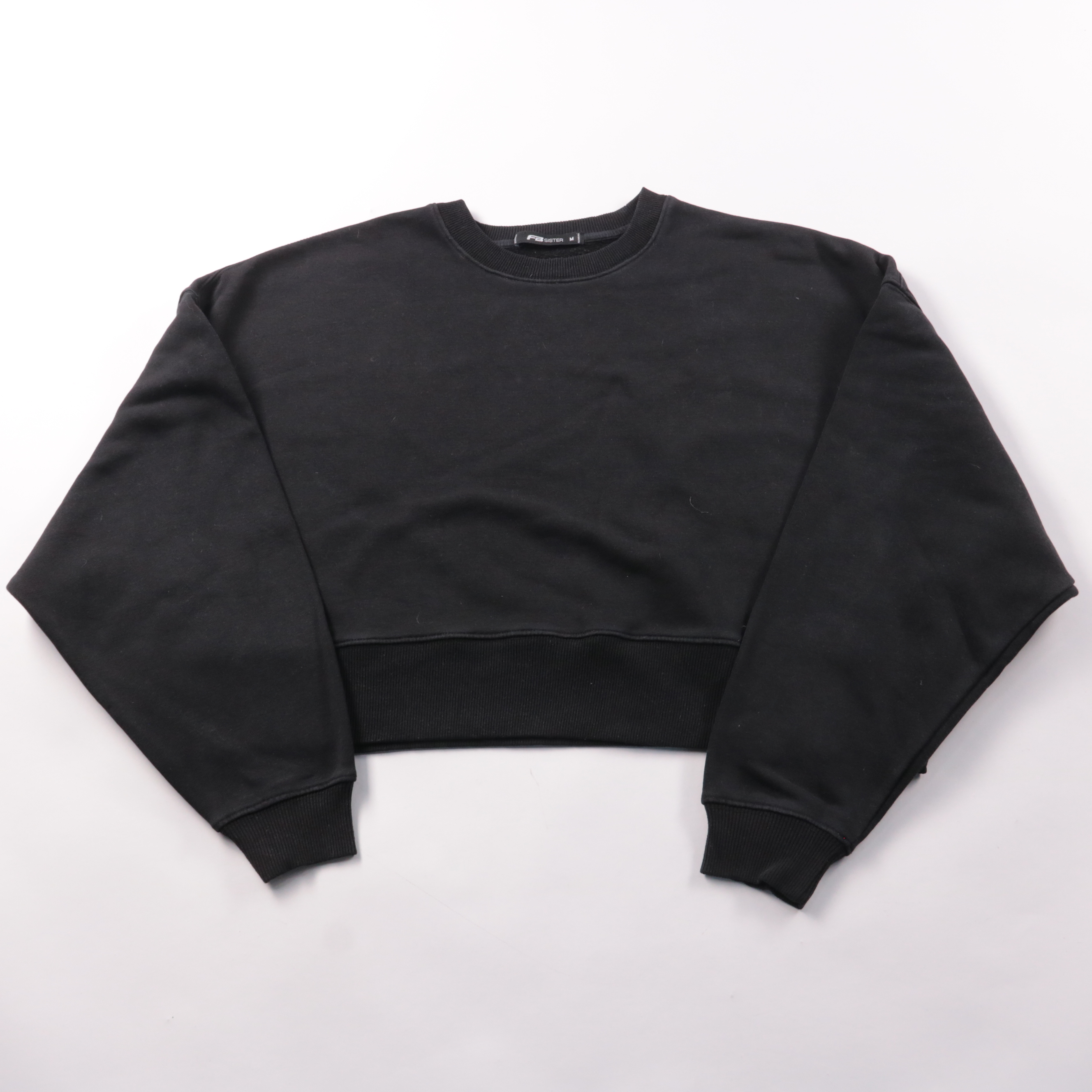 Женский свитшот FB Sister чёрного цвета, укороченный, с круглым вырезом и манжетами. Подойдёт для повседневных образов и прогулок в прохладную погоду, легко сочетается с джинсами и юбками. Плотный материал держит форму и удобен в носке.