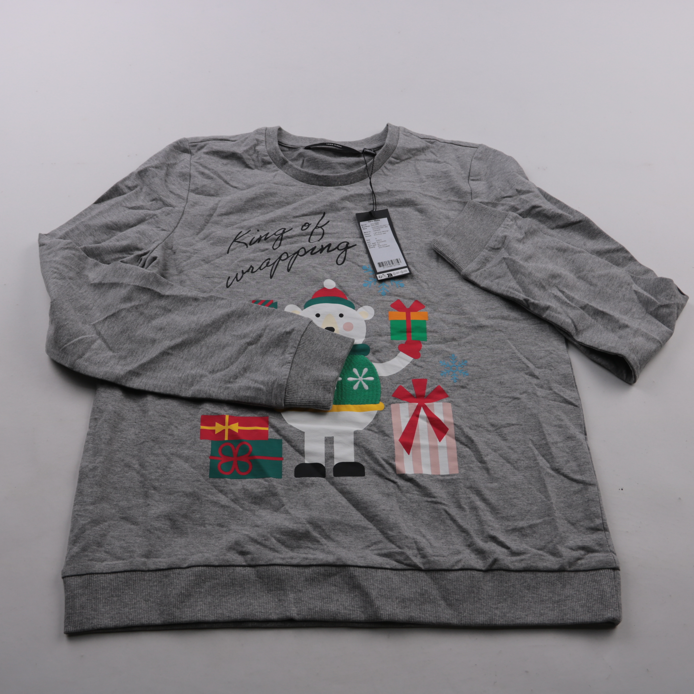 Свитшот Vero Moda светло-серого меланжа с новогодним принтом «King of wrapping» и полярным мишкой. Подойдёт для повседневной носки и уютных праздничных образов дома или на прогулку. Мягкий хлопковый материал с добавлением полиэстера практичен и простой...