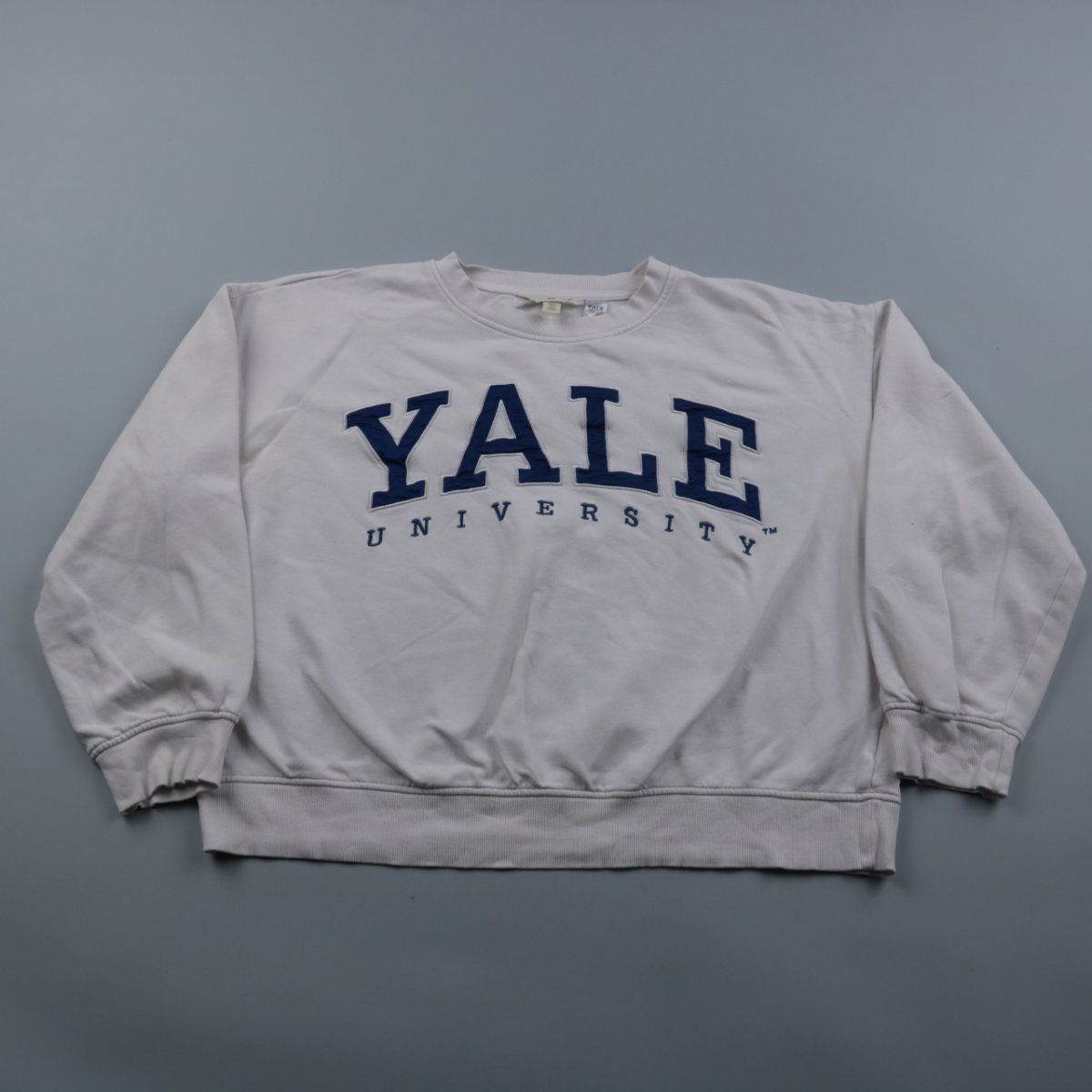 Свитшот H&M светло-серого цвета с принтом YALE UNIVERSITY и круглым вырезом. Подойдёт для повседневных образов и учебы в прохладную погоду. Мягкий футер с начёсом внутри хорошо сохраняет тепло и комфортен в носке.