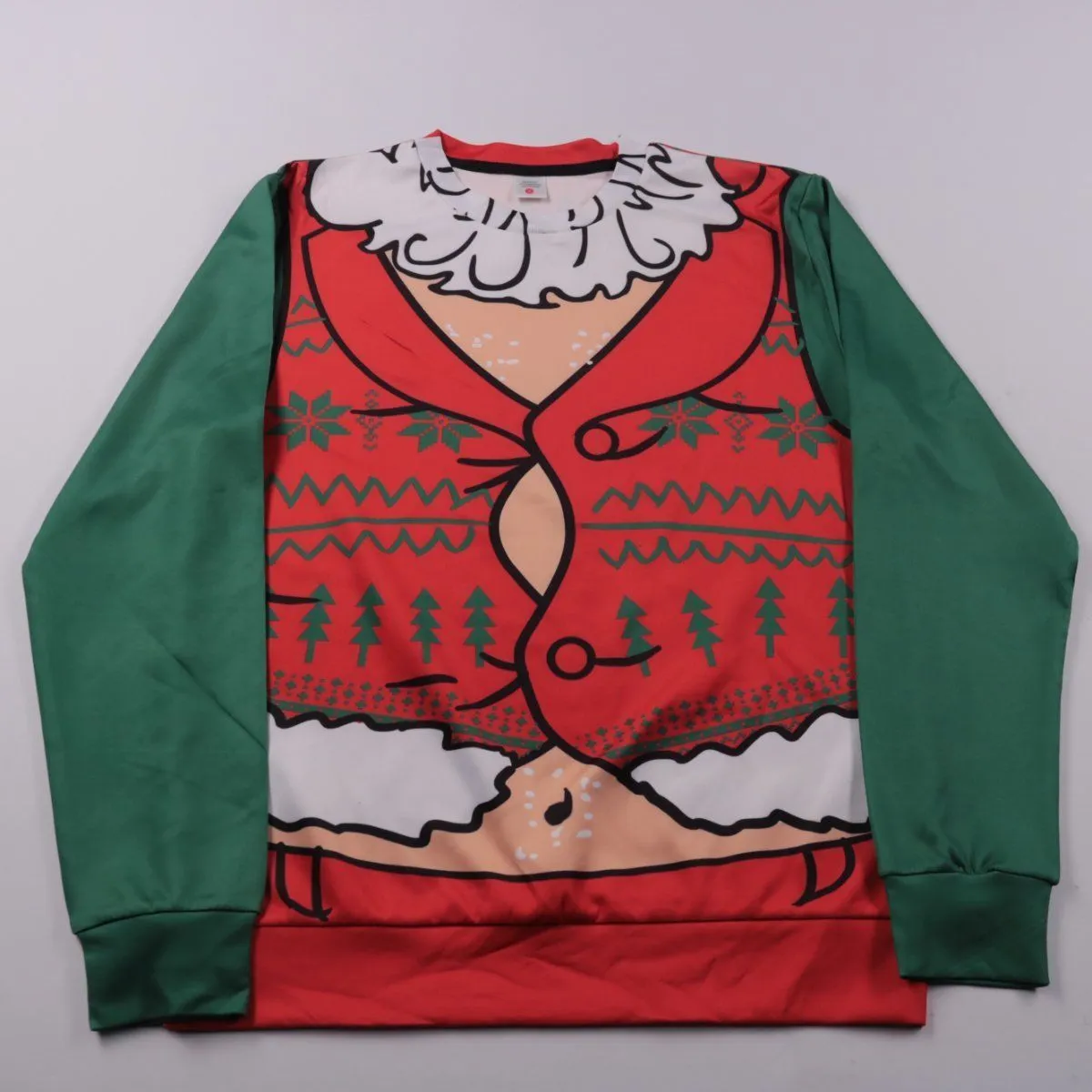 Свитшот с новогодним принтом в виде костюма эльфа/Санта, без капюшона. Подойдёт для праздничных вечеринок, фотосессий и тематических мероприятий. Тянется за счёт добавления спандекса и комфортно сидит в движении.