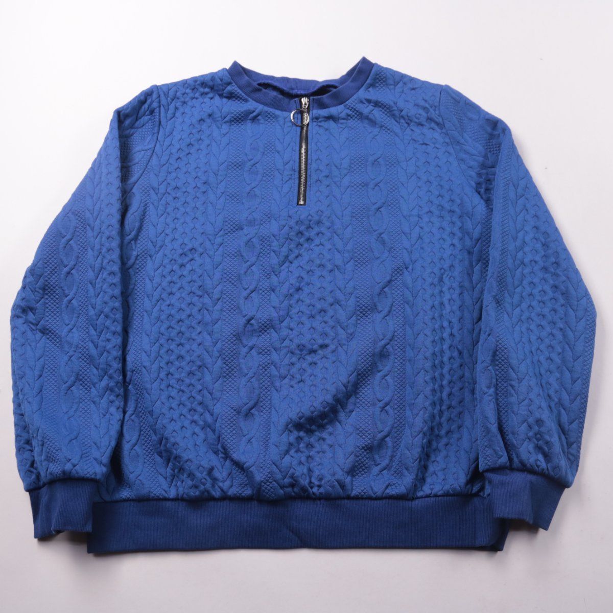 Свитшот без капюшона с короткой молнией у горловины и фактурным узором. Подойдёт для повседневных образов в прохладную погоду и для офиса в стиле casual. Материал тянется и хорошо держит форму.