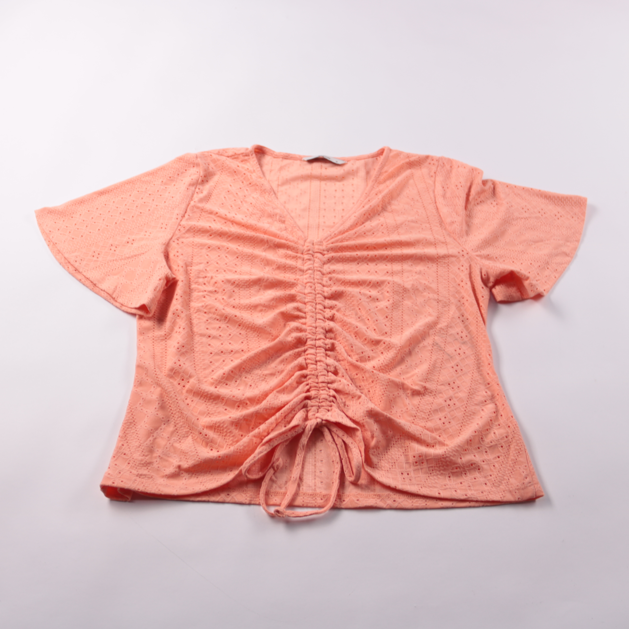 Женский топ Tu персикового цвета с V-образным вырезом и коротким рукавом, выполнен из фактурного трикотажа. Спереди есть кулиска со сборкой, поэтому можно регулировать посадку и длину. Подойдёт для летних прогулок и повседневных образов, материал тянет...