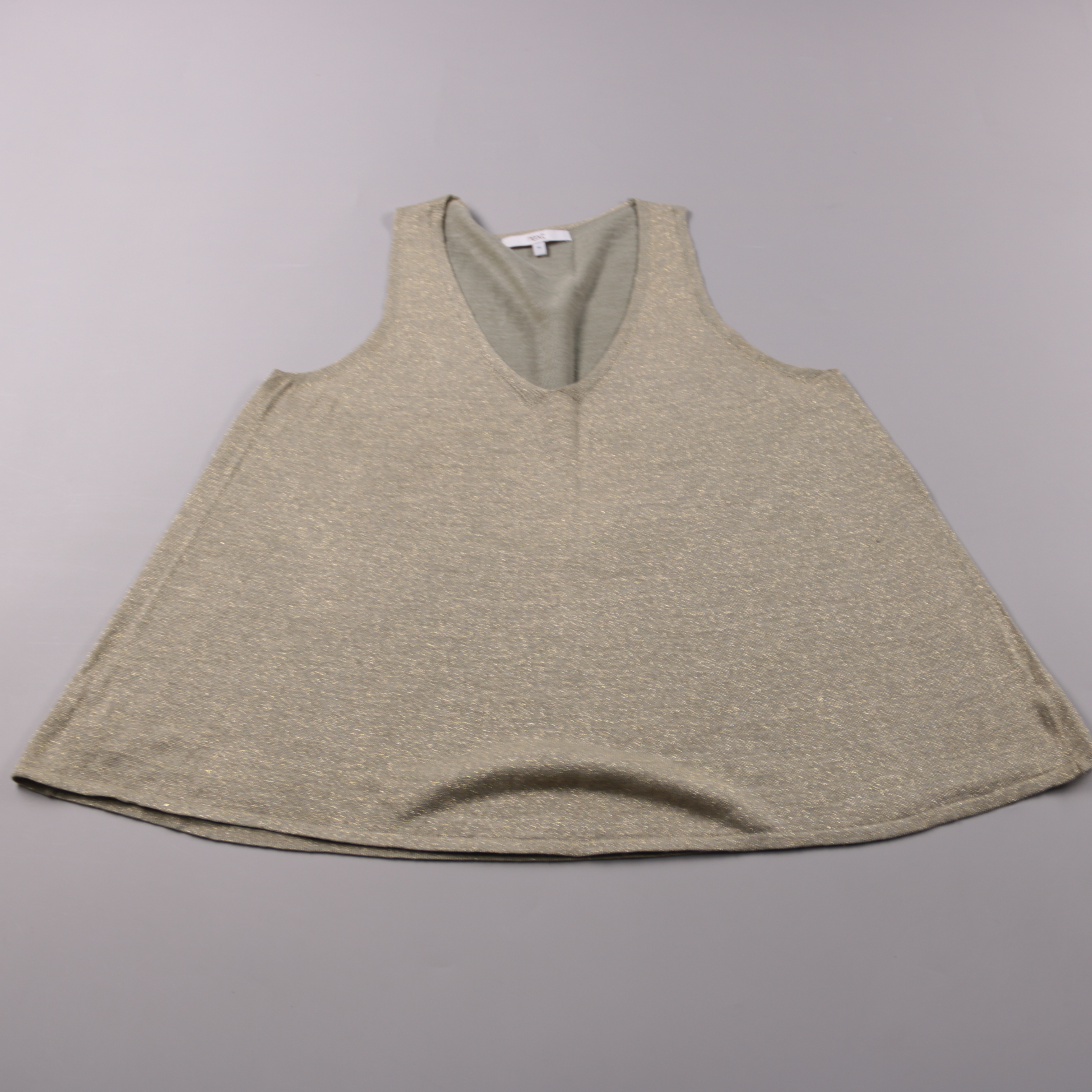 Топ Next с V-образным вырезом и лёгким мерцанием люрекса, без рукавов. Подойдёт для вечера, праздника или в офис под жакет. Трикотаж тянется и комфортно садится по фигуре.
