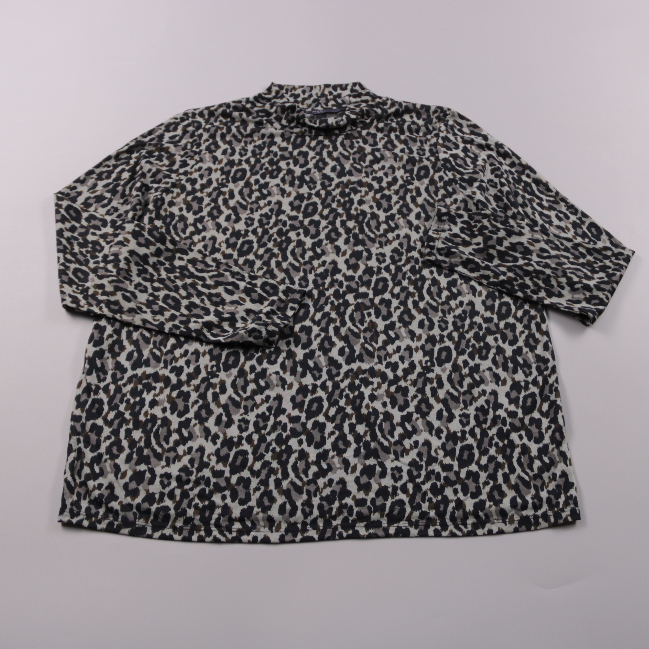 Женский лонгслив M&S с леопардовым принтом и воротником-стойкой. Подойдёт для повседневных образов в офис или на прогулку, легко сочетается с джинсами и однотонными брюками. Тонкая ткань комфортно носится под жакет или кардиган и не занимает много места.