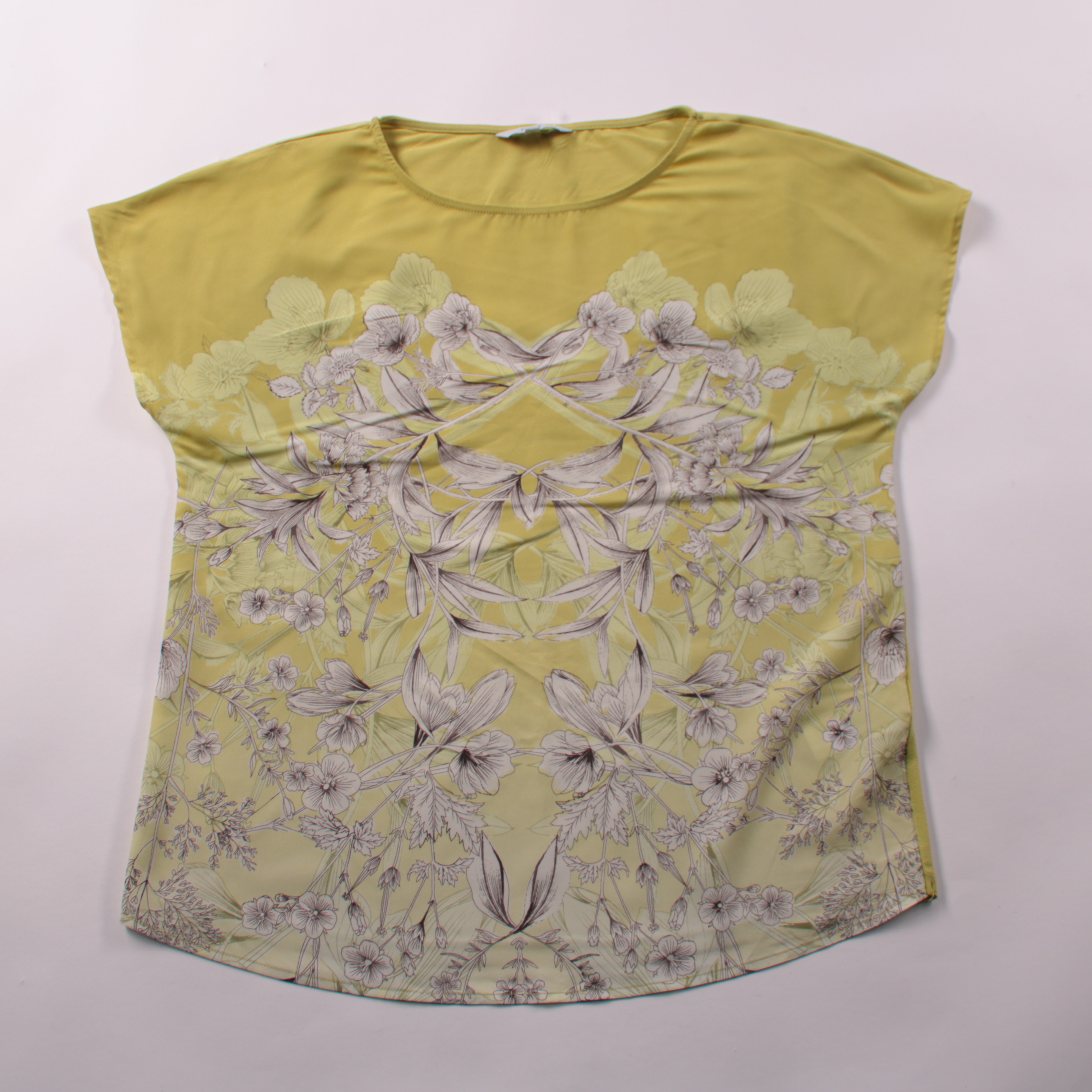 Футболка Next оливково-жёлтого цвета с крупным цветочным принтом и свободным кроем. Подойдёт для повседневных летних образов с джинсами или шортами. Практичная ткань почти не мнётся и быстро сохнет.