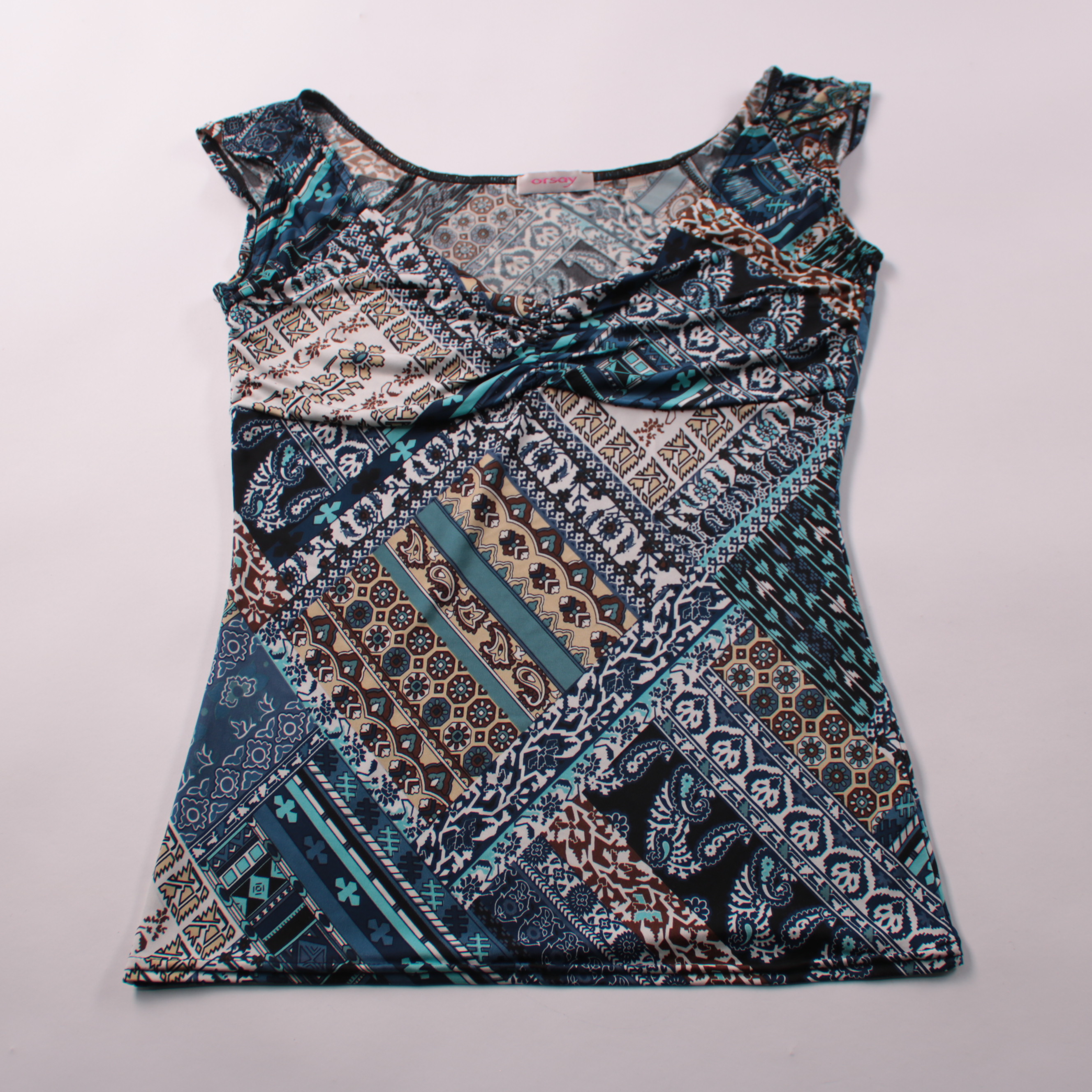 Топ Orsay с ярким орнаментальным принтом в стиле пэчворк и драпировкой на груди. Подойдёт для лета и отпуска, хорошо сочетается с однотонными шортами, юбкой или джинсами. Лёгкий и компактный, удобно брать с собой в поездки.