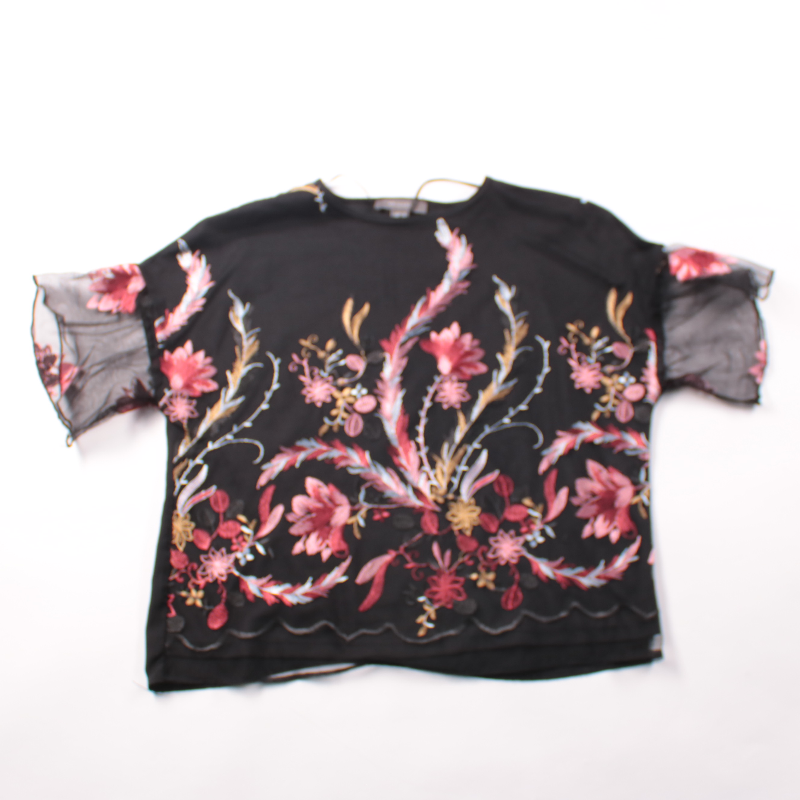 Футболка Primark чёрного цвета с ярким цветочным принтом и полупрозрачными рукавами из сетки. Подойдёт для повседневных образов и выхода, когда хочется добавить акцент в одежду. Лёгкая ткань быстро сохнет и почти не мнётся.