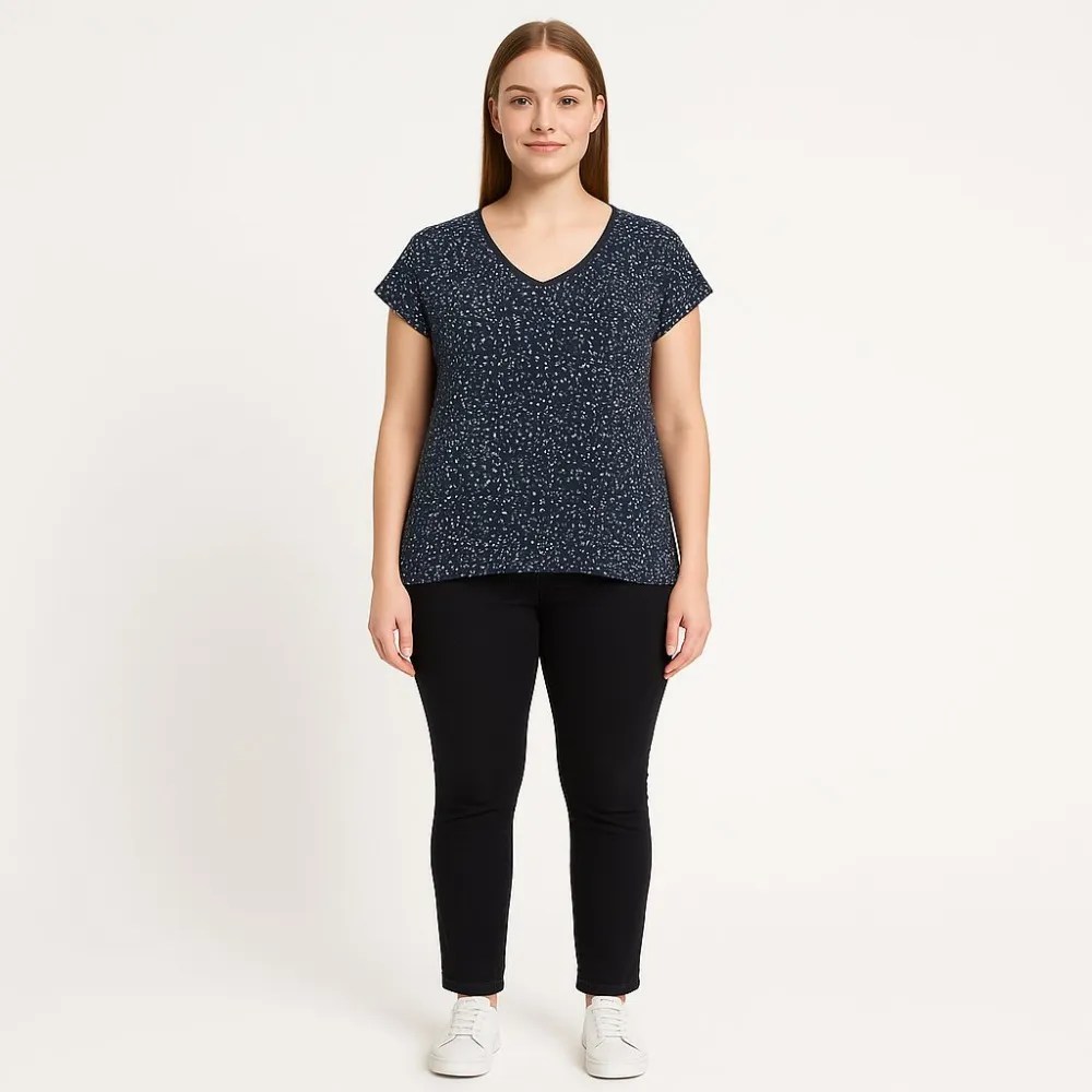 Женская футболка Esprit тёмно-синего цвета с мелким принтом и V-образным вырезом. Подойдёт для повседневных образов и офиса в стиле casual, легко сочетается с джинсами и брюками. Мягкий трикотаж комфортно носится и не стесняет движений.