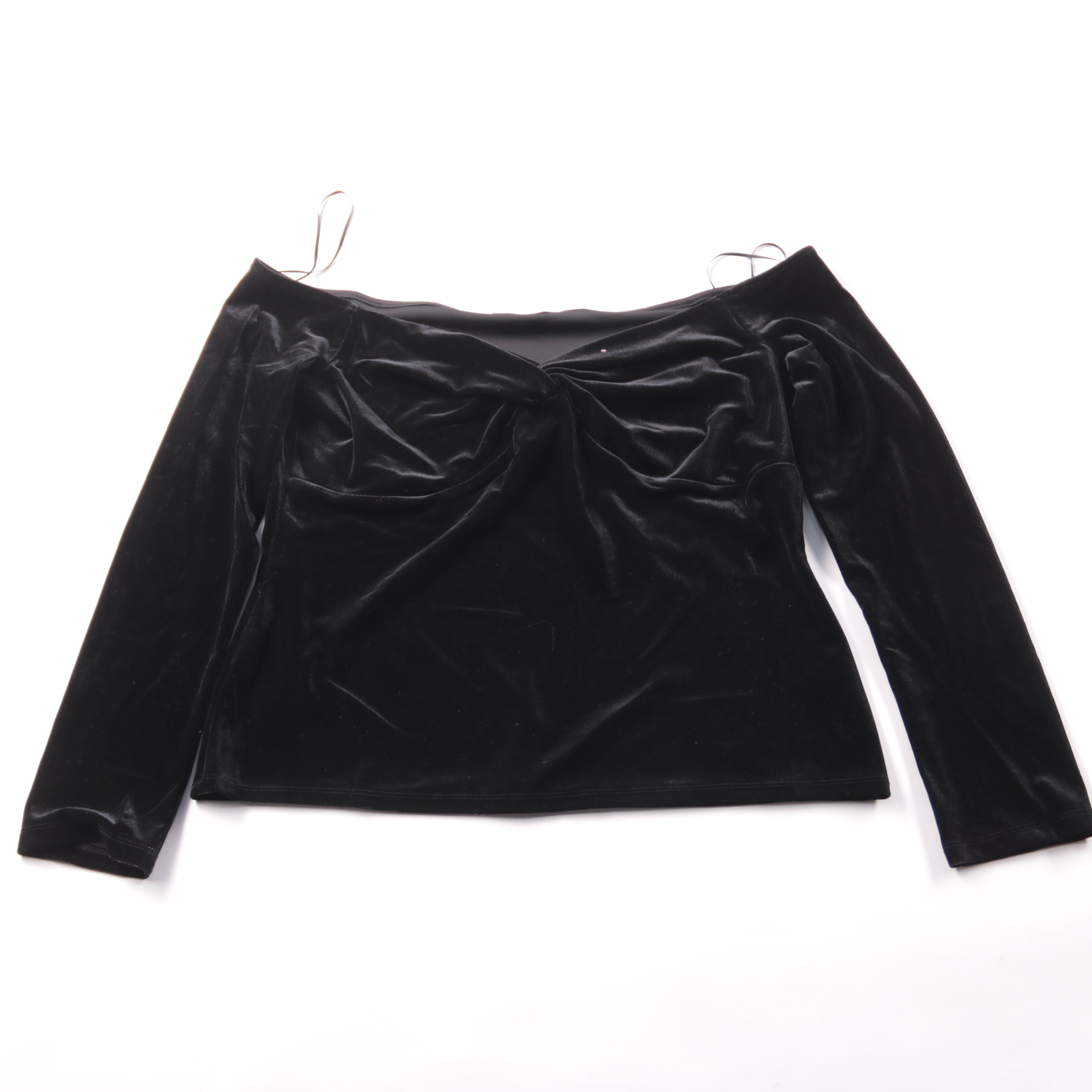 Бархатный лонгслив George чёрного цвета с открытыми плечами и драпировкой спереди. Подойдёт для вечерних выходов и образов на праздник, хорошо сочетается с юбкой или брюками с высокой посадкой. Эластичная ткань тянется и комфортно садится по фигуре.