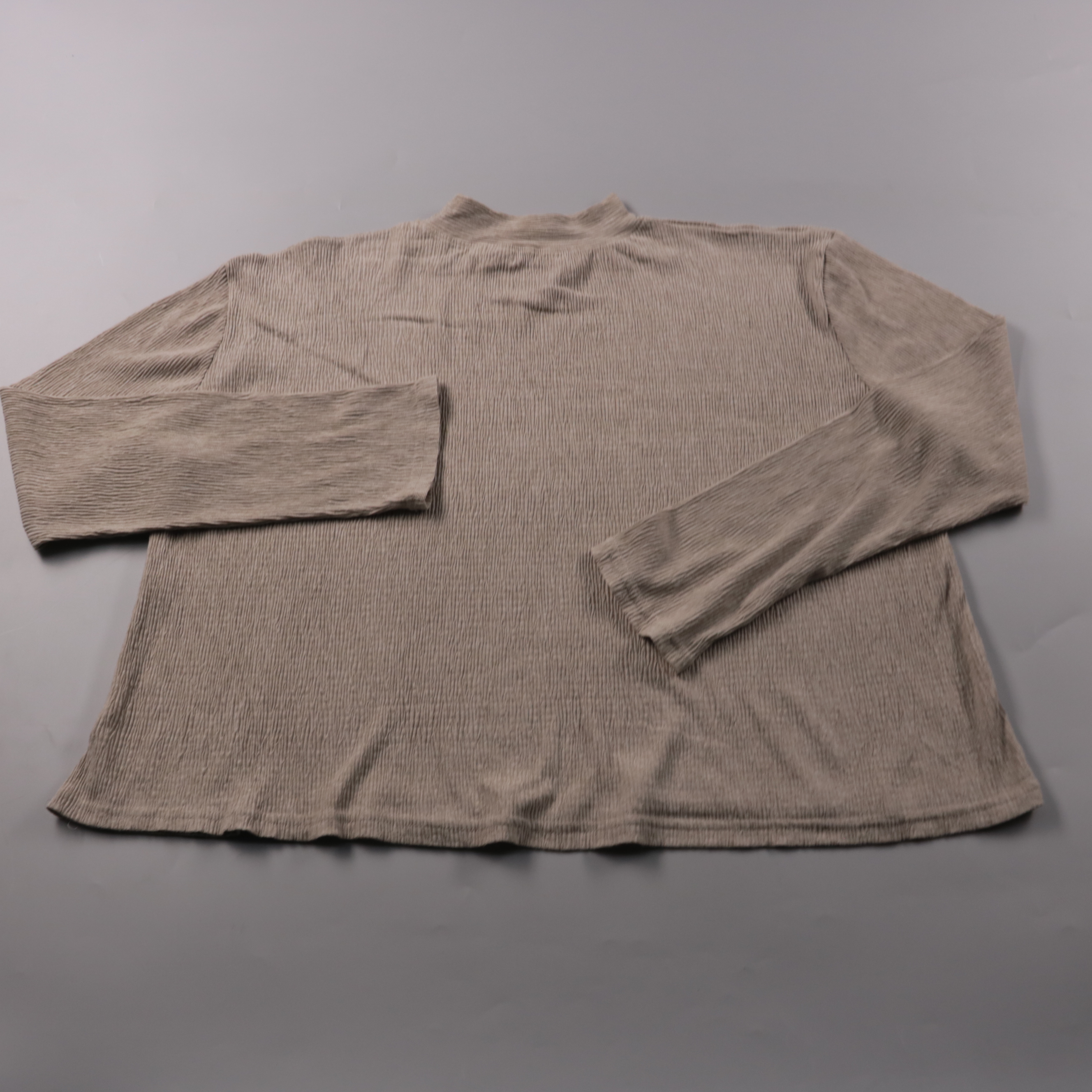 Женский лонгслив в рубчик с небольшим воротником-стойкой, без видимого бренда на бирке. Подойдёт для повседневных образов и как базовый слой в прохладную погоду. Трикотаж тянется и удобно садится по фигуре.