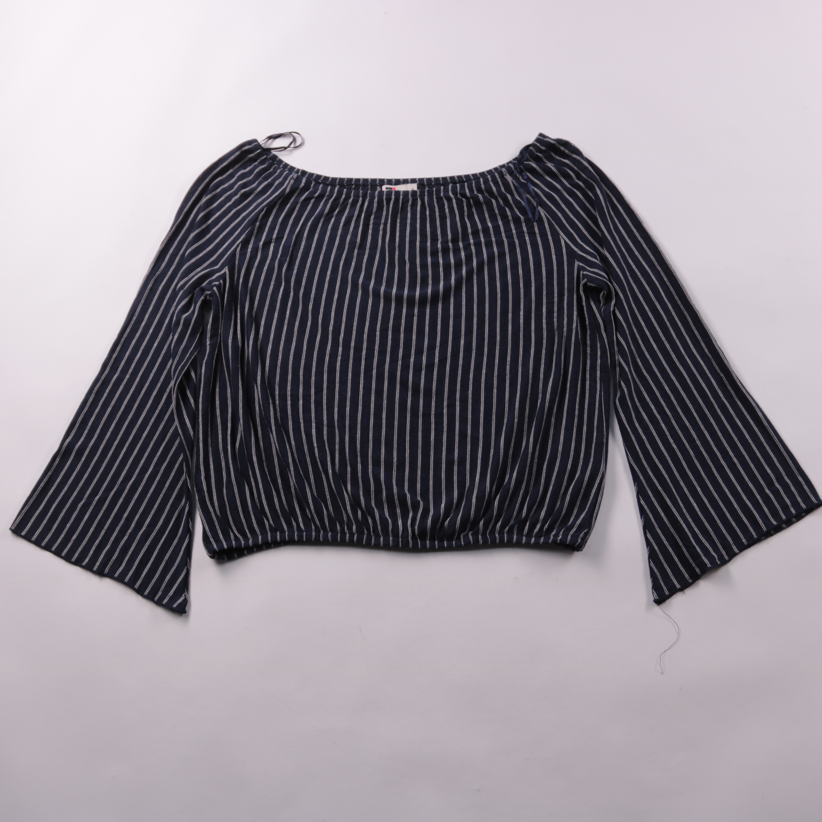 Женский укороченный топ EMT тёмно-синего цвета в тонкую полоску, с широким вырезом и рукавами 3/4. Подойдёт для повседневных образов с джинсами или юбкой в тёплый сезон и как слой под жакет в демисезон. Лёгкая ткань (полиэстер/район) хорошо держит форм...