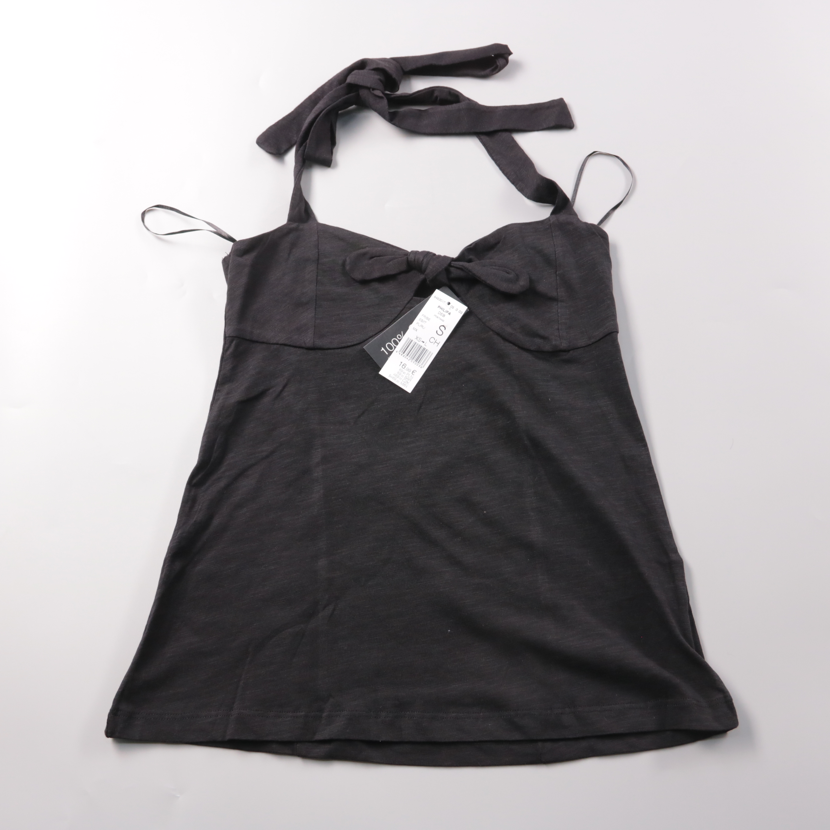 Женский топ Etam чёрного цвета из хлопка, с завязками на шее и декоративным бантом на груди. Подойдёт для лета и тёплой погоды, можно носить с джинсами, юбкой или шортами. Натуральный материал хорошо пропускает воздух и комфортен в носке.