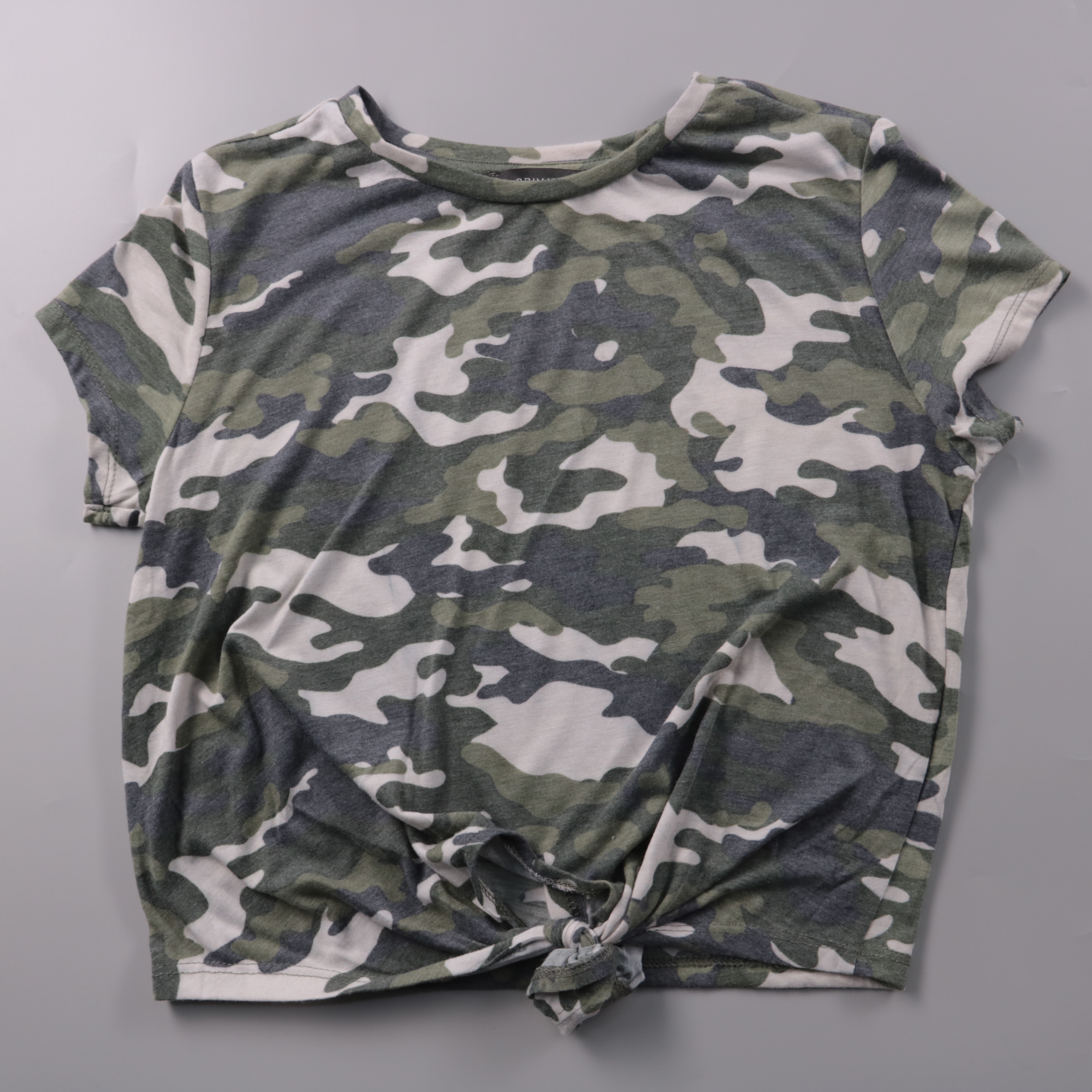 Футболка Primark с камуфляжным принтом и коротким рукавом, низ завязывается узлом. Подойдёт для повседневных образов и отдыха в тёплую погоду. Мягкий трикотаж комфортно носится и не сковывает движения.