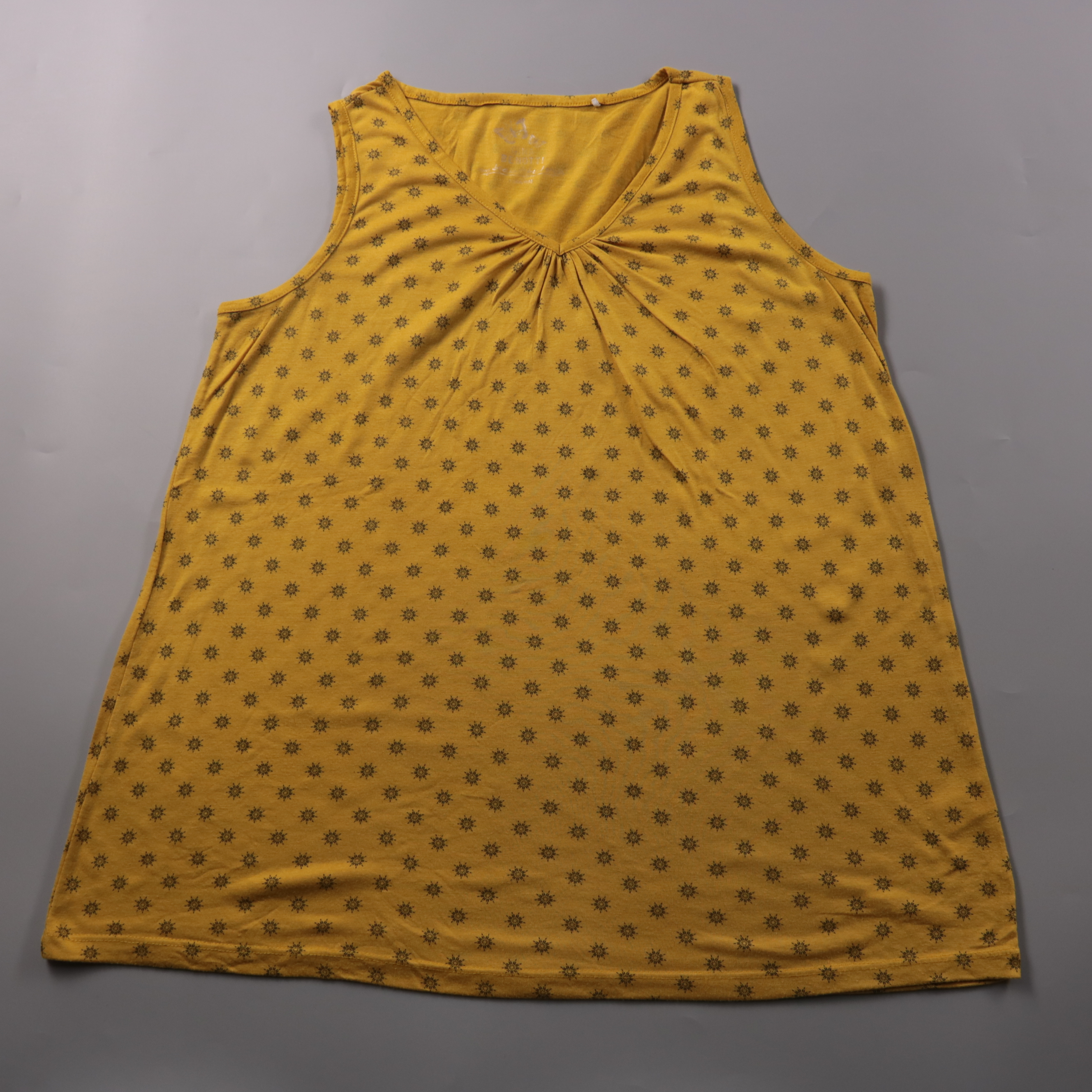 Женская майка Gina Benotti горчичного цвета с мелким принтом и V-образным вырезом со сборкой спереди. Подойдёт для лета и тёплой погоды, можно носить с джинсами, шортами или юбкой на каждый день. Ткань мягкая и хорошо дышит за счёт вискозы.