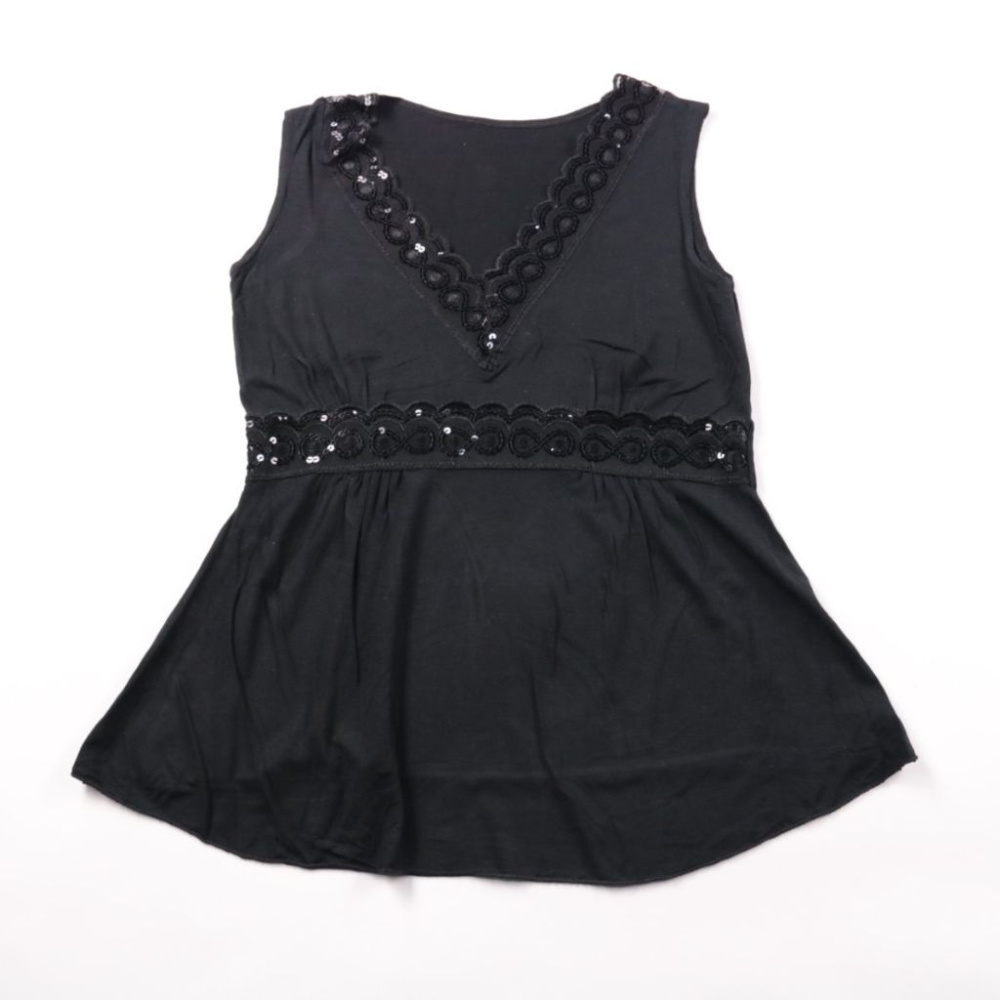 Женский чёрный топ без рукавов с V-образным вырезом и декоративной отделкой с пайетками по горловине и линии талии. Подойдёт для вечерних выходов и праздников, легко сочетается с юбкой или брюками. Лёгкая ткань комфортно носится и не стесняет движений.