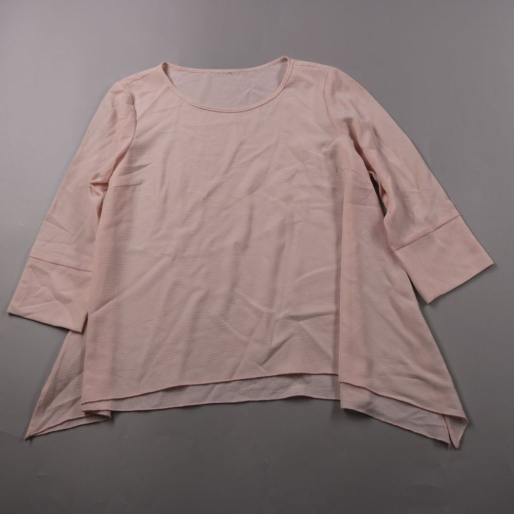 Женский лонгслив свободного кроя в нежно-розовом цвете, без заметного бренда на бирке. Подойдёт для повседневных образов и как базовый слой в прохладную погоду. Мягкий трикотаж приятен к телу и не сковывает движения.