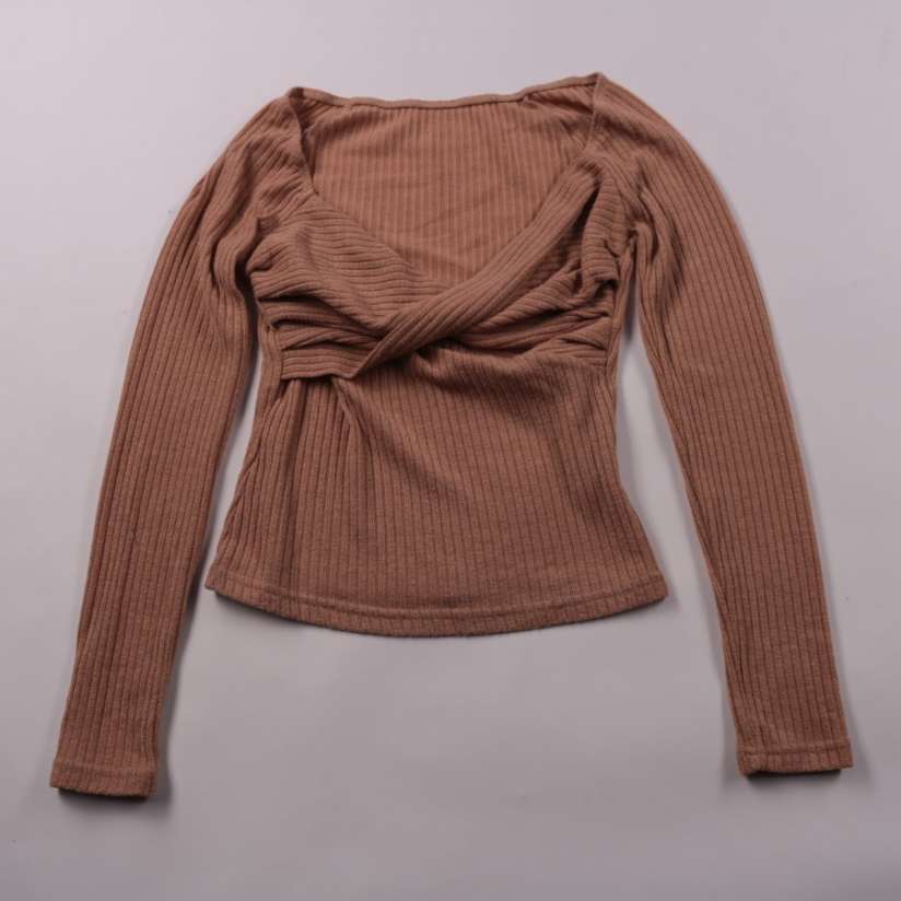 Рифлёный лонгслив Shein коричневого оттенка с перекрёстной драпировкой на груди и глубоким вырезом. Подойдёт для повседневных образов и вечерних выходов, хорошо смотрится с джинсами или юбкой. Эластичный материал тянется и комфортно садится по фигуре.
