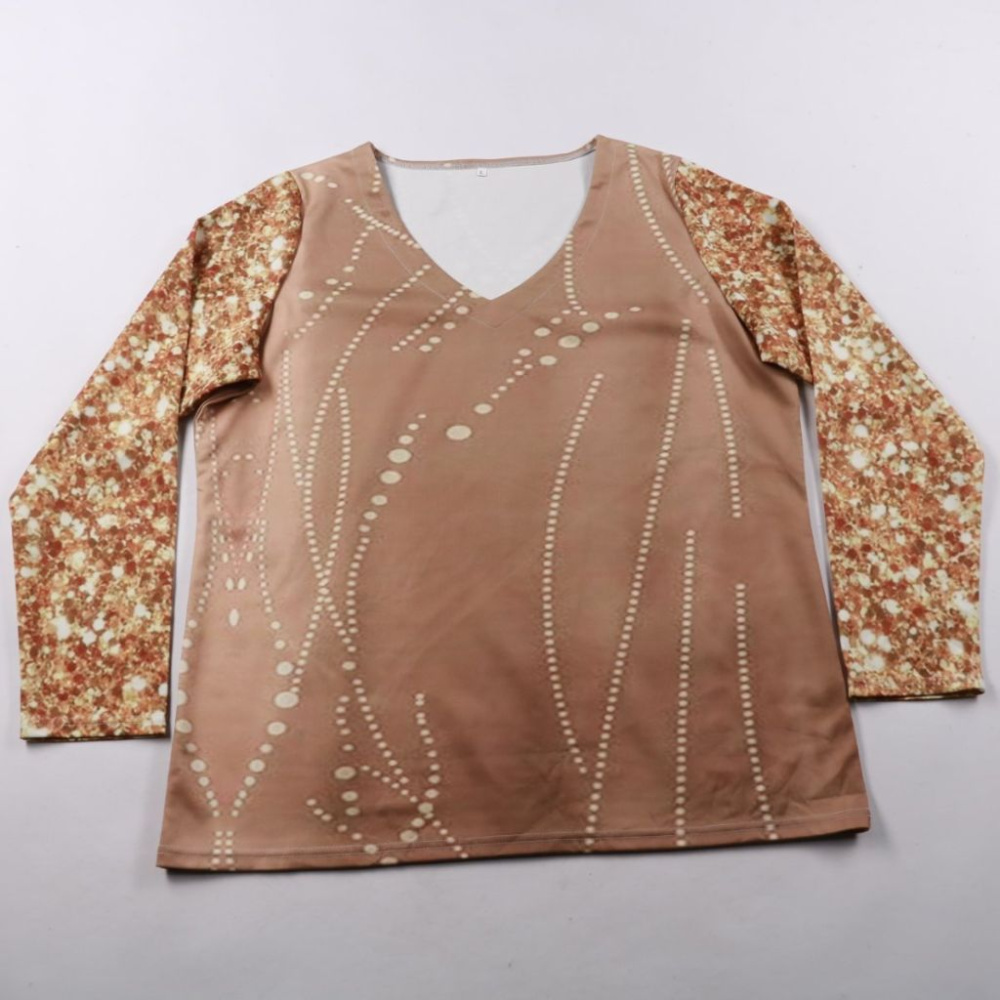 Женский лонгслив с V-образным вырезом и комбинированным принтом: однотонный бежевый перед и рукава с узором. Подойдёт для повседневных образов и офиса с однотонными брюками или джинсами. Лёгкий трикотаж комфортно сидит и не стесняет движений.
