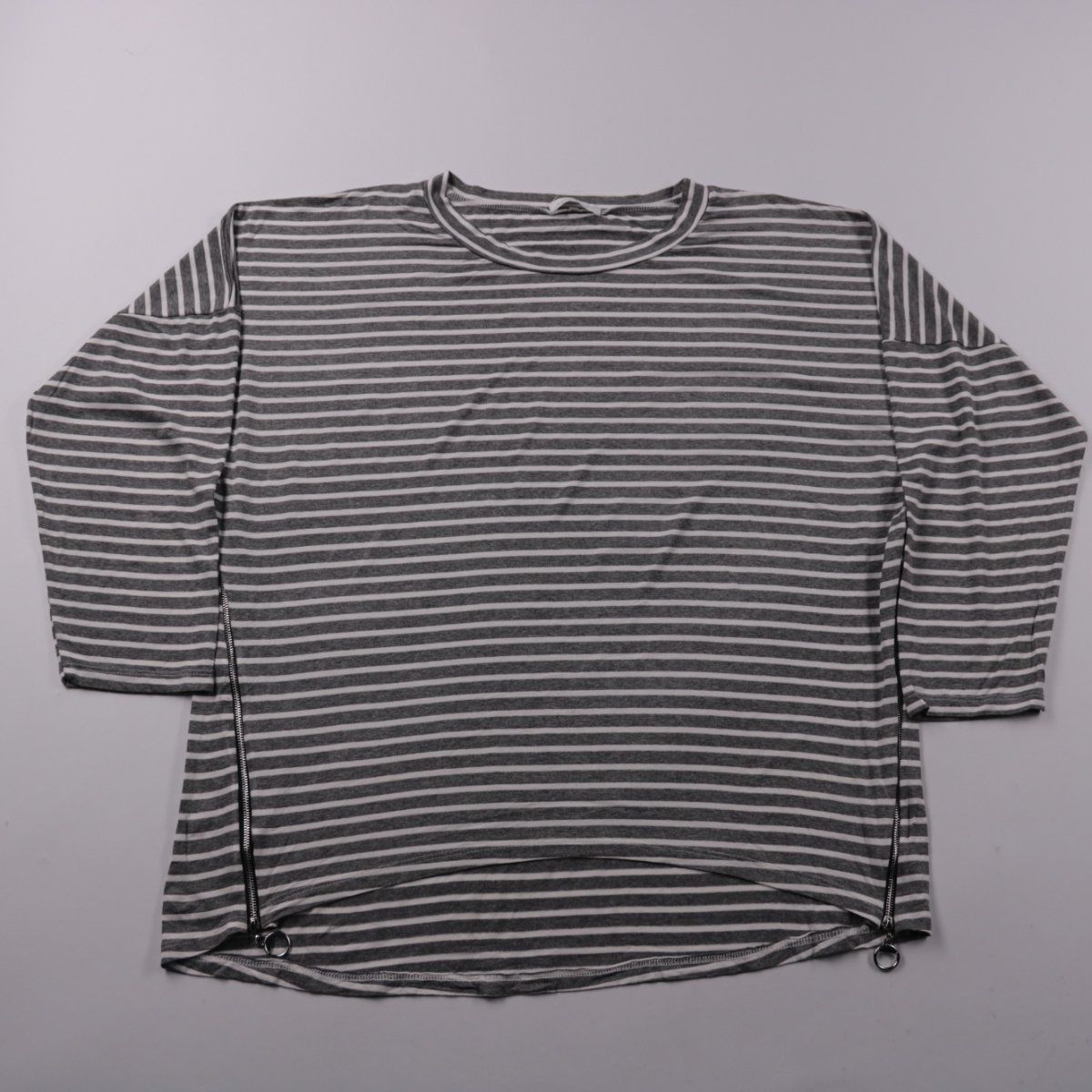 Женский лонгслив в серо-белую полоску, без указанного бренда, с боковыми молниями по низу. Подойдёт для повседневных образов в межсезонье и прохладные летние вечера, хорошо сочетается с джинсами и брюками. Молнии позволяют регулировать посадку и делать разрезы по бокам для более свободного силуэта.