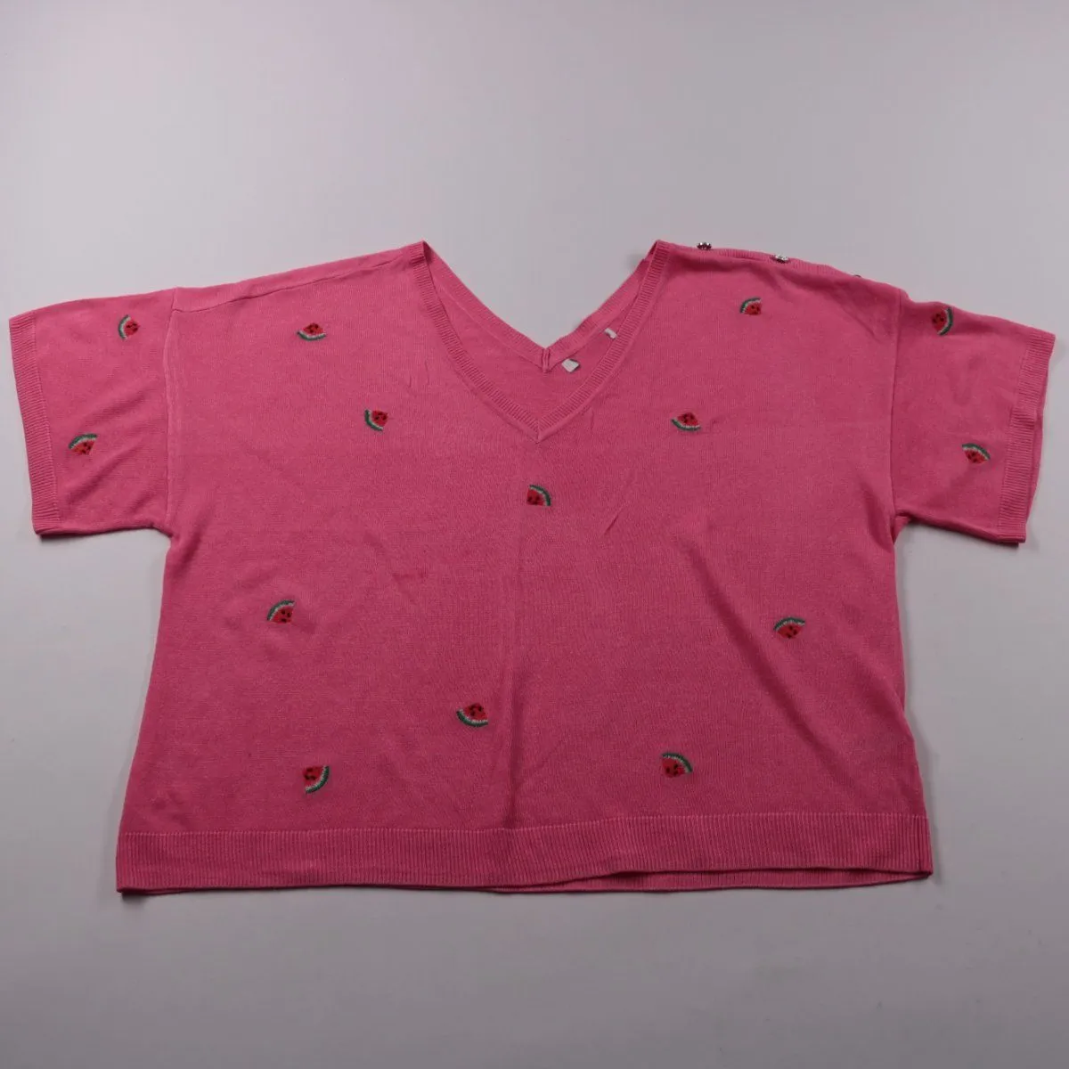 Розовая футболка Next с V-образным вырезом и коротким рукавом, украшена мелкой вышивкой в виде долек арбуза. Подойдёт для повседневных летних образов и отдыха. Трикотажный материал приятный к телу и не мнётся сильно.