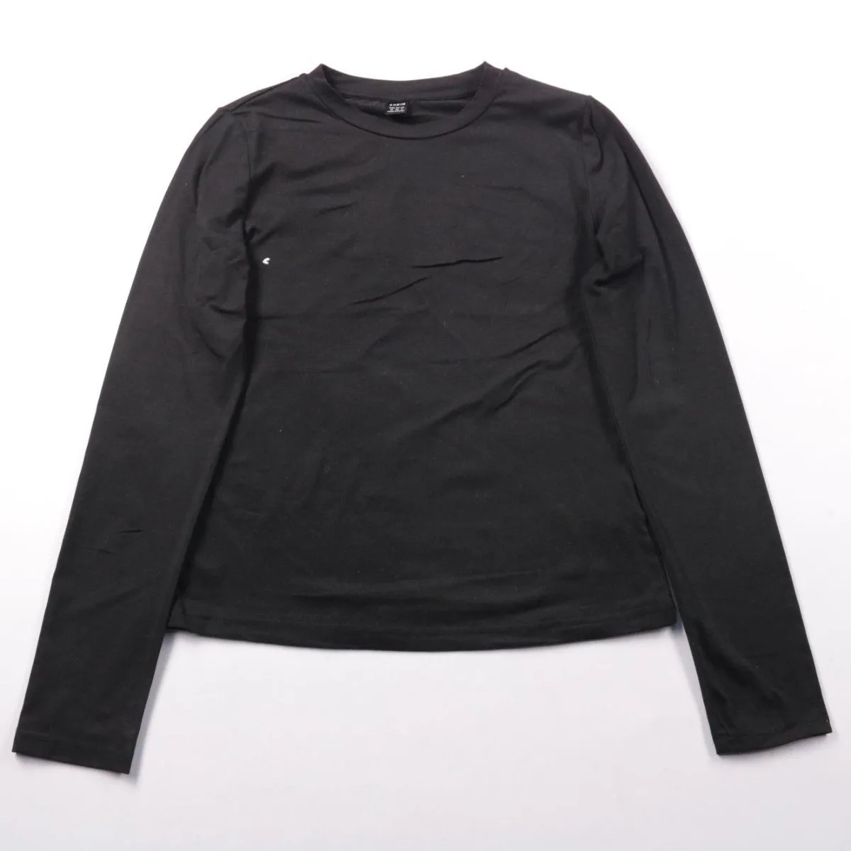 Чёрный лонгслив Shein из гладкого эластичного трикотажа, хорошо тянется и сидит по фигуре. Подойдёт для повседневных образов и как базовый слой под жакет или куртку. Материал почти не мнётся и быстро сохнет после стирки.