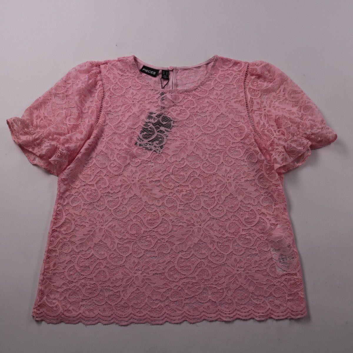 Кружевной топ Pieces в розовом оттенке Rose Shadow с коротким рукавом и фигурным (фестончатым) низом. Подойдёт для летних образов и выходов, хорошо сочетается с джинсами или юбкой. Материал тянется за счёт эластана, поэтому комфортно садится по фигуре.