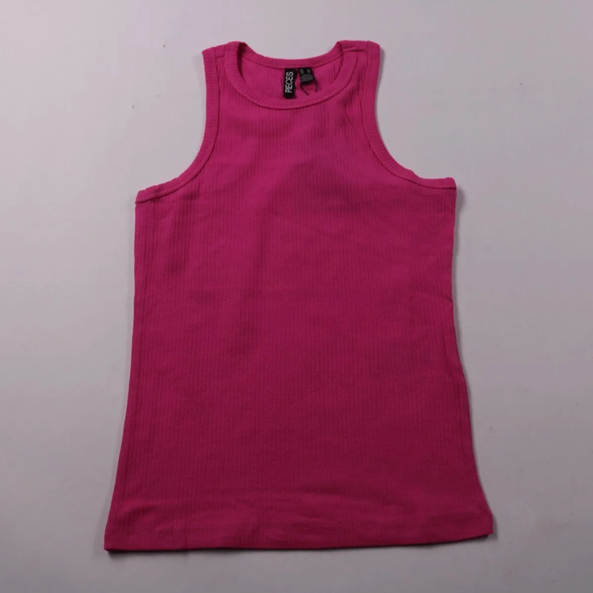 Трикотажная майка Pieces в рубчик ярко-розового (фуксия) цвета, облегающий крой и круглый вырез. Подойдёт для лета и тренировок или как базовый слой под рубашку/жакет. Эластичный материал хорошо тянется и комфортно сидит по фигуре.