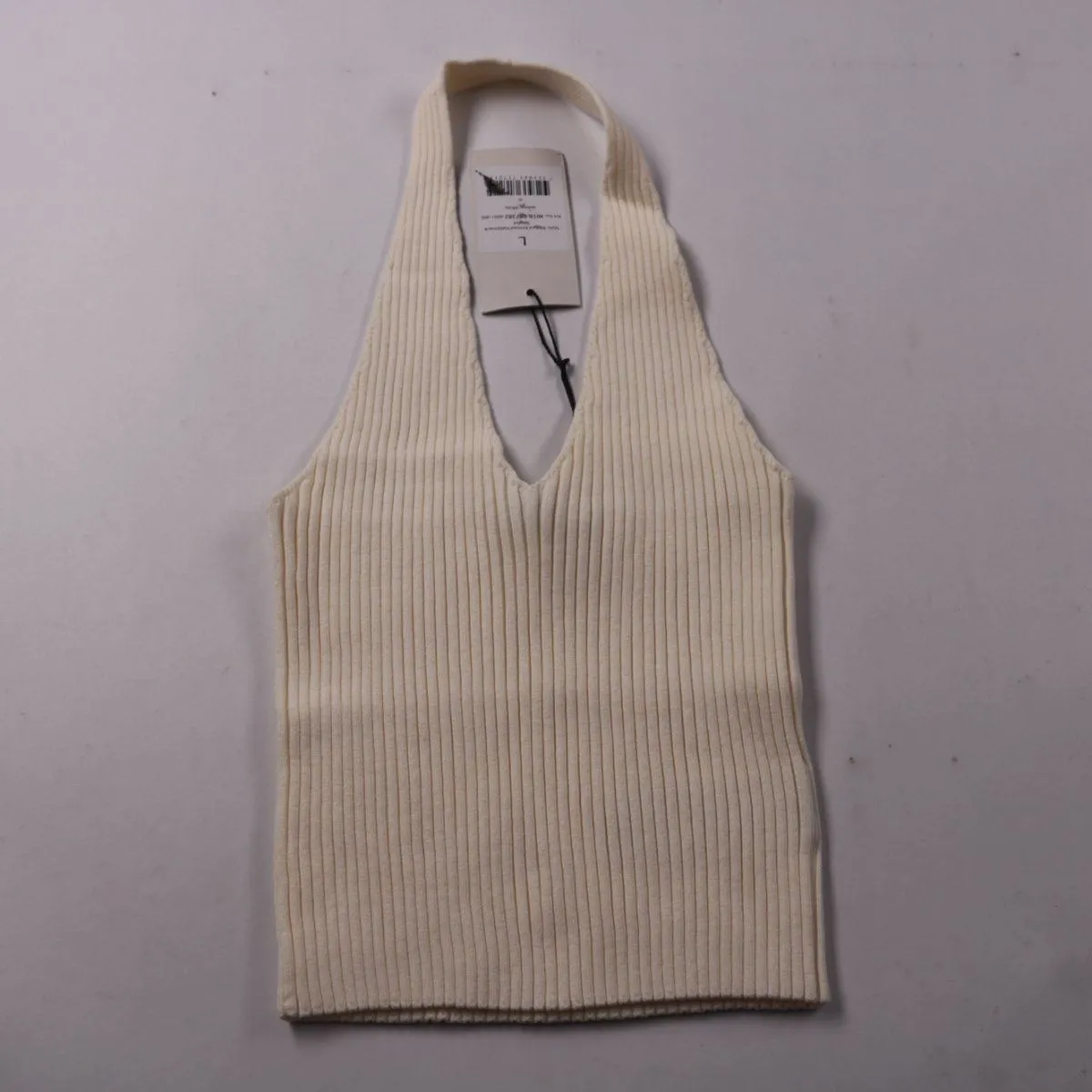 Женский трикотажный топ NA-KD в рубчик, молочно-бежевого цвета, с V-образным вырезом и халтер-горловиной. Подойдёт для летних образов и как базовый слой под жакет или рубашку. Эластичная вязка хорошо тянется и комфортно садится по фигуре.